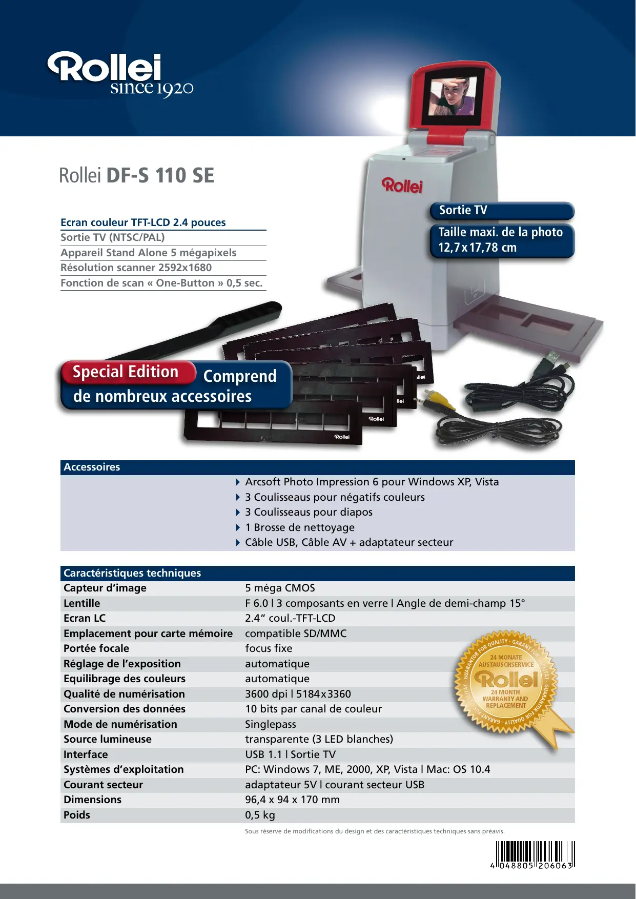 | Formats de film compatibles | Diapositives 35 mm, Négatifs 35 mm, Négatifs 110 mm |