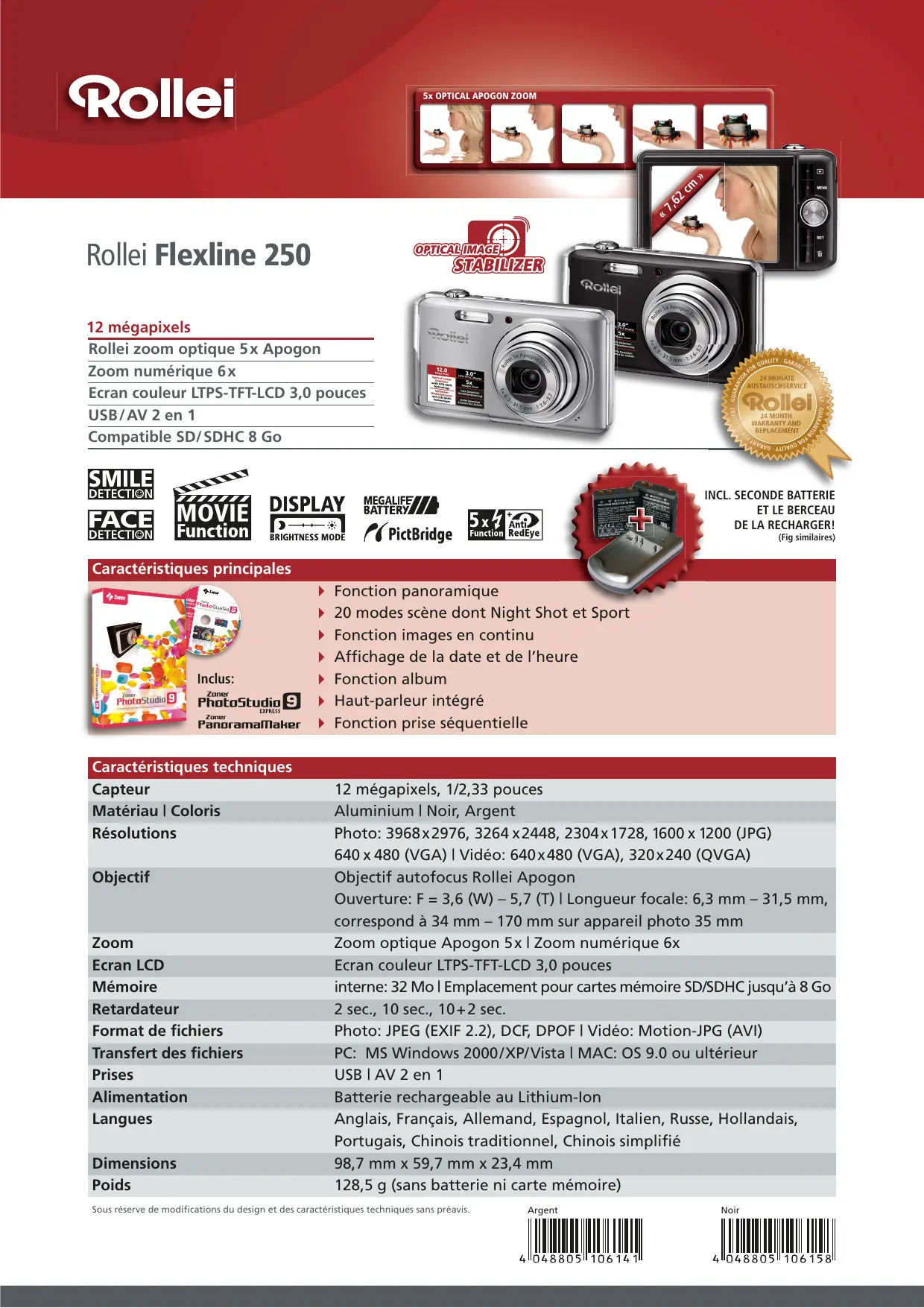 | Fonctions spéciales | Fonction panoramique, modes scène Night Shot et Sport, détection de visage, détection de sourire, stabilisateur d'image optique |