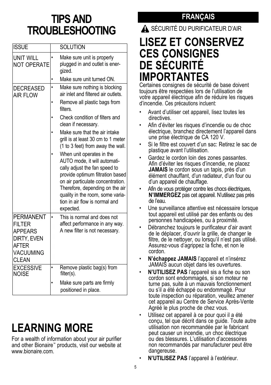 POUR EN SAVOIR PLUS Pour une gamme complète d'informations sur votre purificateur d'air ainsi que sur les autres produits Bionaire”, visitez notre site web au www.bionaire.com.
