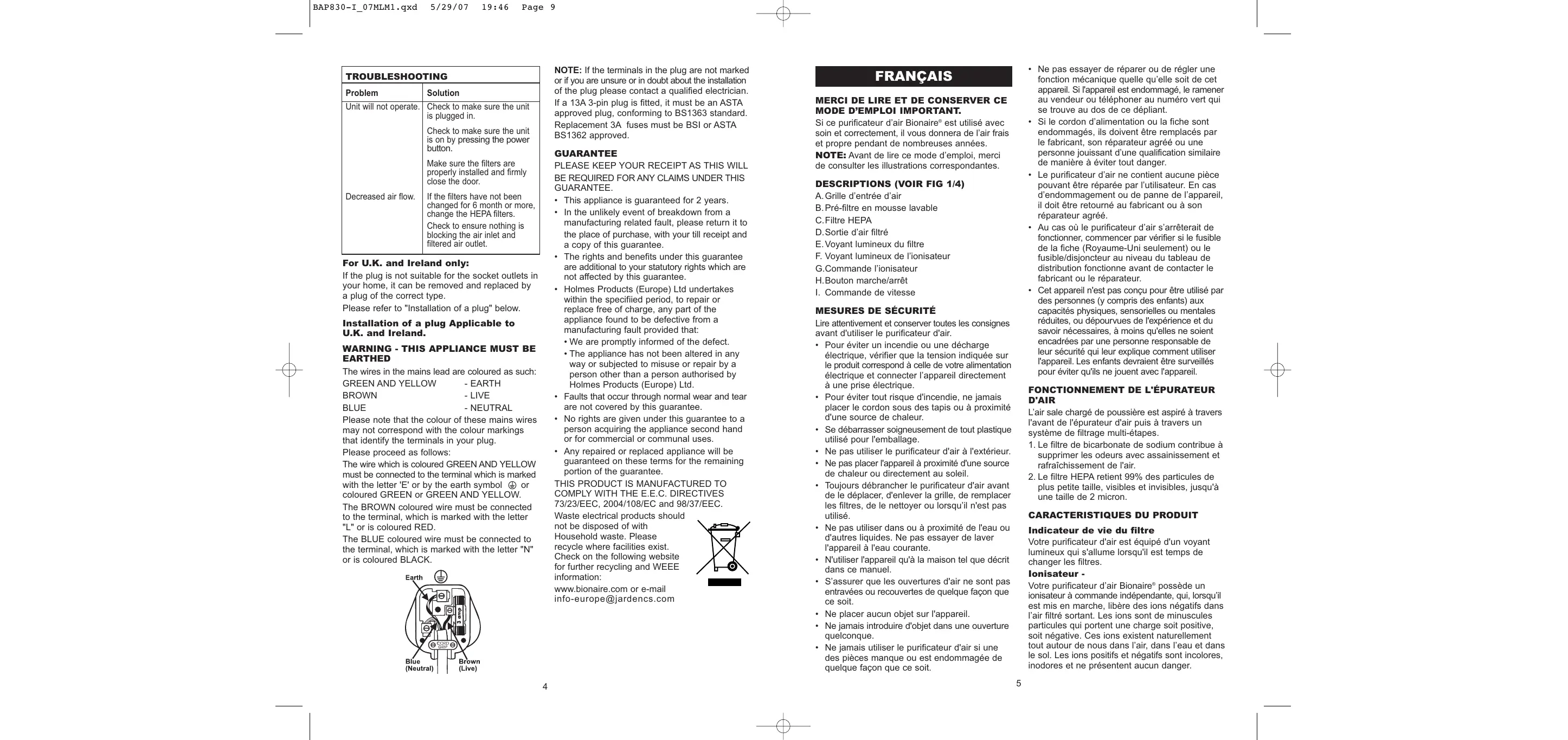 • La garantie engage Holmes Products (Europe) Ltd à réparer ou à remplacer gratuitement, toute pièce de l’appareil qui se révèle défectueuse sous réserve que: • Nous soyons prévenus rapidement du défaut de fabrication. • L’appareil n’ait pas été altéré de quelque manière que ce soit ou ait été utilisé abusivement ou réparé par une personne autre qu’une personne agréée par Holmes Products (Europe) Ltd • Cette garantie n’étend aucun droit à toute personne acquérant l’appareil d’occasion ou pour un usage commercial ou communal. • Si l’appareil est réparé ou remplacé sous la garantie vos droits sont conservés pour la partie restante de cette garantie. CE PRODUIT EST FABRIQUE EN CONFORMITE AVEC LES DIRECTIVES DE LA C.E.E. 73/23/EEC, 2004/108/EC et 98/37/EEC. Les appareils électriques mis aux rebuts ne doivent pas être mélangés aux ordures ménagères. Veuillez recycler si vous en avez la possibilité.Allez au site Web ci-dessous pour plus d’informations sur le recyclage et la directive WEEE : www.bionaire.com ou par e-mail à info-europe@jardencs.com