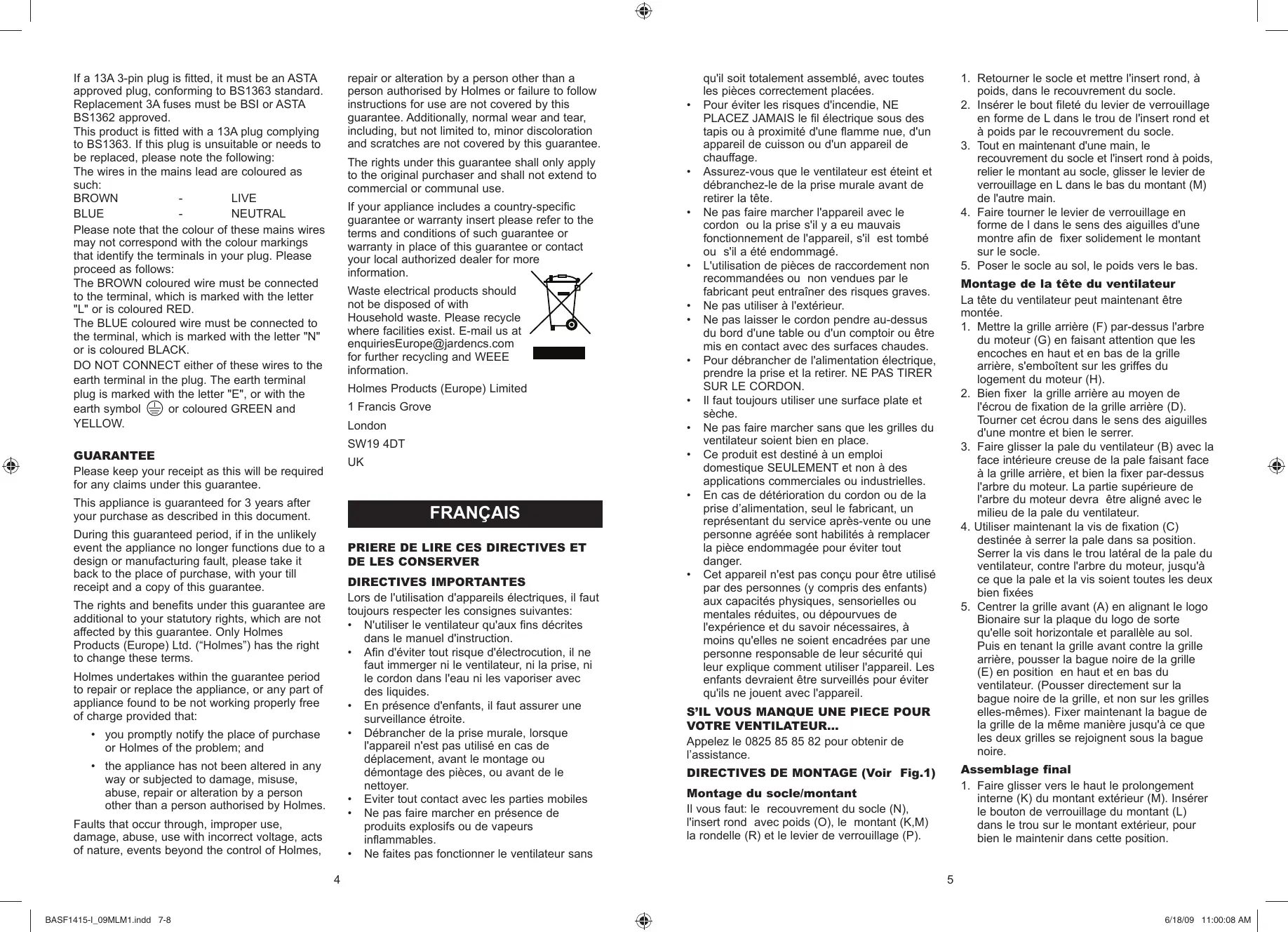 - Ne faites pas fonctionner le ventilateur sans The rights and benefits under this guarantee are additional to your statutory rights, which are not affected by this guarantee. Only Holmes Products (Europe) Ltd. (“Holmes”) has the right to change these terms. Holmes undertakes within the guarantee period to repair or replace the appliance, or any part of appliance found to be not working properly free of charge provided that: