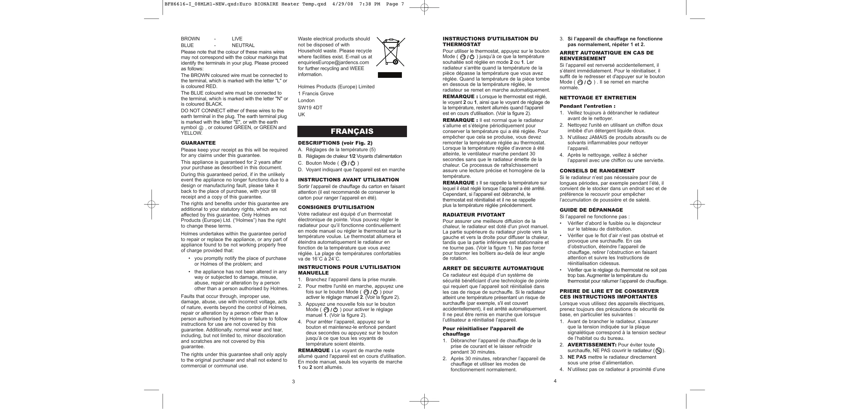 enquiriesEurope@jardencs.com pour plus d’informations sur le recyclage et la directive WEEE. Holmes Products (Europe) Limited 1 Francis Grove London