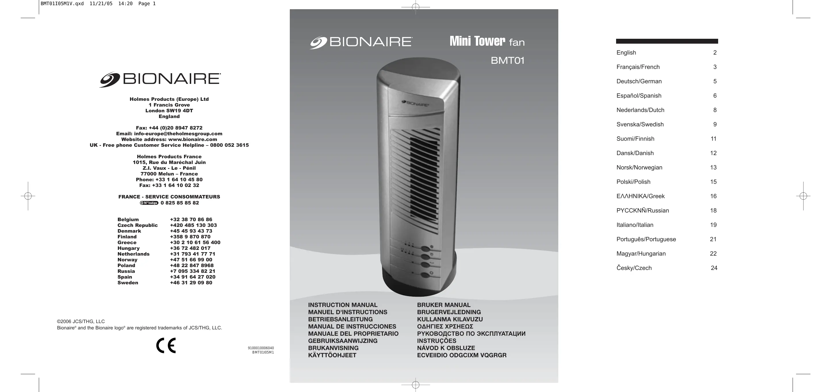 - Si l’appareil est réparé ou remplacé sous la garantie vos droits sont conservés pour la partie restante de cette garantie. CE PRODUIT EST FABRIQUE POUR RESPECTER LES DIRECTIVES CEE 73/23/EEC, 89/336/EEC, 98/37/EEC. Les équipements électriques mis aux rebuts ne doivent pas être mélangés aux ordures ménagères. Veuillez recycler si vous en avez la possibilité. Allez au site Web cidessous pour plus d’informations sur le recyclage et la directive WEEE : www.bionaire.com ou e-mail info-europe@theholmesgroup.com