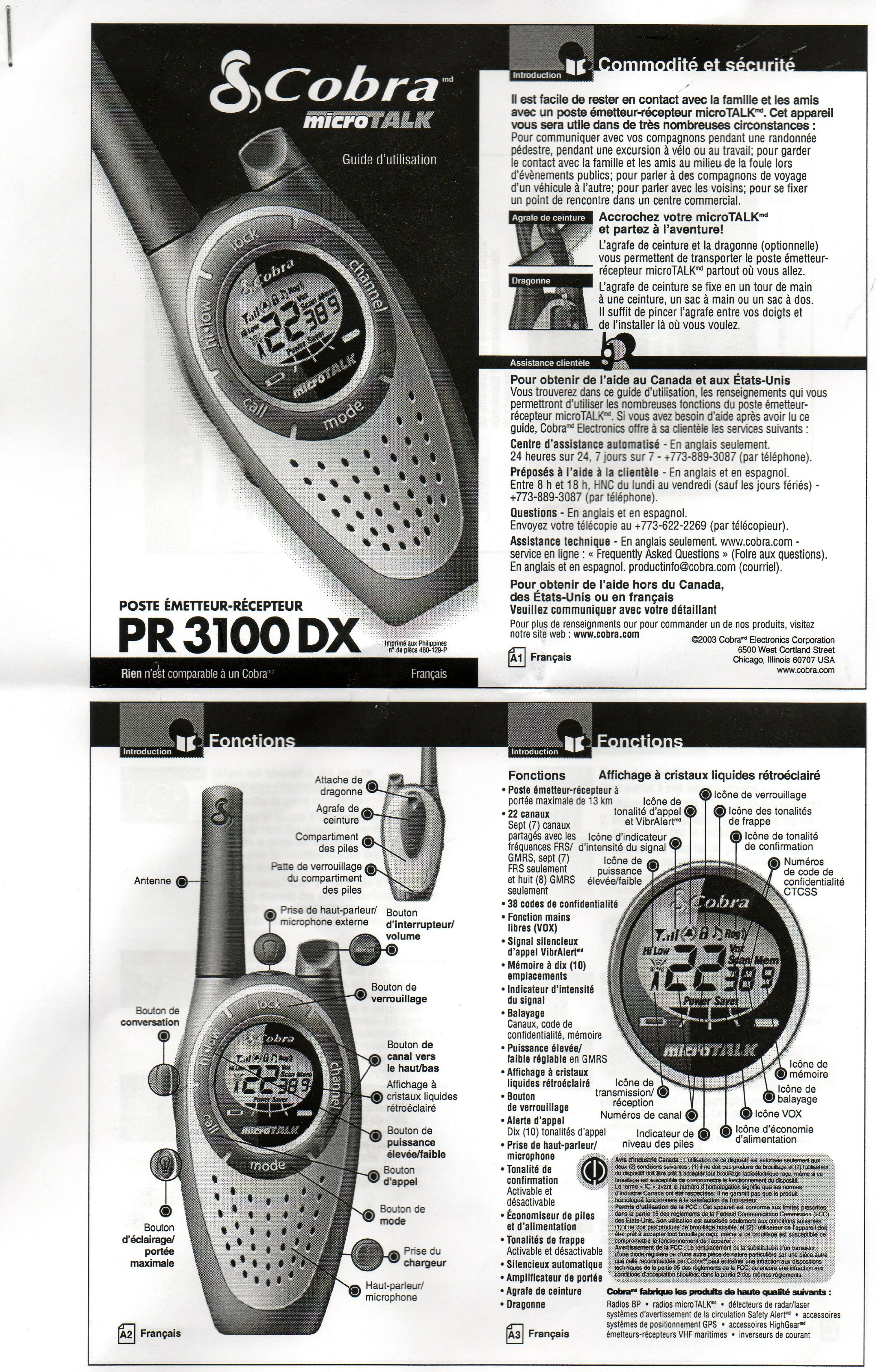 Vous trouverez dans ce guide d'utilisation, les renseignements qui vous permettent d'utiliser les nombreuses fonctions du poste émetteur-récepteur microTALK md. Si vous avez besoin d'aide après avoir lu ce guide, Cobra md Electronics offre à sa clientèle les services suivants :
