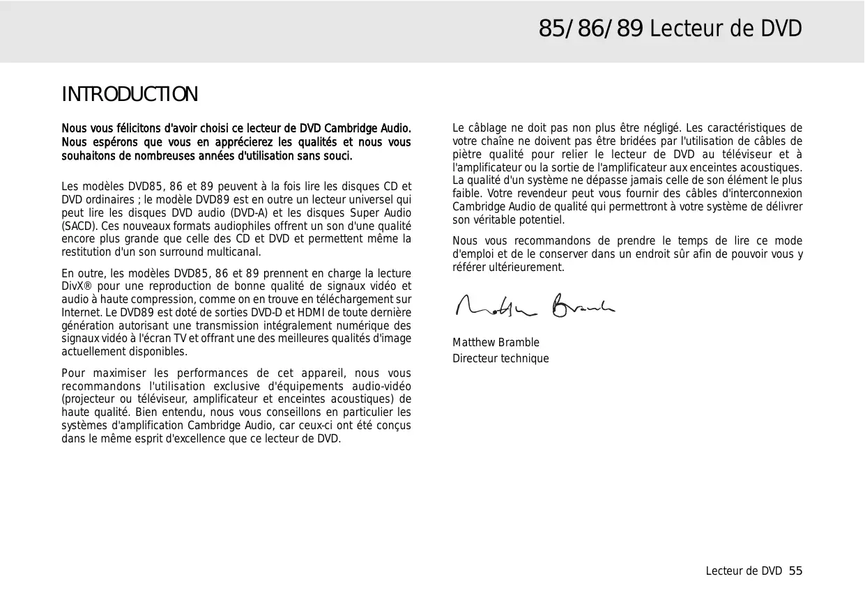- Caractéristiques techniques 54 Lecteur de DVD 85/86/89 Lecteur de DVD INTRODUCTION Nous vous félicitons d'avoir choisi ce lecteur de DVD Cambridge Audio. Nous espérons que vous en apprécierez les qualités et nous vous souhaitons de nombreuses années d'utilisation sans souci. Les modèles DVD85, 86 et 89 peuvent à la fois lire les disques CD et DVD ordinaires ; le modèle DVD89 est en outre un lecteur universel qui peut lire les disques DVD audio (DVD-A) et les disques Super Audio (SACD). Ces nouveaux formats audiophiles offrent un son d'une qualité encore plus grande que celle des CD et DVD et permettent même la restitution d'un son surround multicanal. En outre, les modèles DVD85, 86 et 89 prennent en charge la lecture DivX® pour une reproduction de bonne qualité de signaux vidéo et audio à haute compression, comme on en trouve en téléchargement sur Internet. Le DVD89 est doté de sorties DVD-D et HDMI de toute dernière génération autorisant une transmission intégralement numérique des signaux vidéo à l'écran TV et offrant une des meilleures qualités d'image actuellement disponibles. Le câblage ne doit pas non plus être négligé. Les caractéristiques de votre chaîne ne doivent pas être bridées par l'utilisation de câbles de piètre qualité pour relier le lecteur de DVD au téléviseur et à l'amplificateur ou la sortie de l'amplificateur aux enceintes acoustiques. La qualité d'un système ne dépasse jamais celle de son élément le plus faible. Votre revendeur peut vous fournir des câbles d'interconnexion Cambridge Audio de qualité qui permettront à votre système de délivrer son véritable potentiel. Nous vous recommandons de prendre le temps de lire ce mode d'emploi et de le conserver dans un endroit sûr afin de pouvoir vous y référer ultérieurement. Matthew Bramble Directeur technique Pour maximiser les performances de cet appareil, nous vous recommandons l'utilisation exclusive d'équipements audio-vidéo (projecteur ou téléviseur, amplificateur et enceintes acoustiques) de haute qualité. Bien entendu, nous vous conseillons en particulier les systèmes d'amplification Cambridge Audio, car ceux-ci ont été conçus dans le même esprit d'excellence que ce lecteur de DVD. Lecteur de DVD 55 p. 78