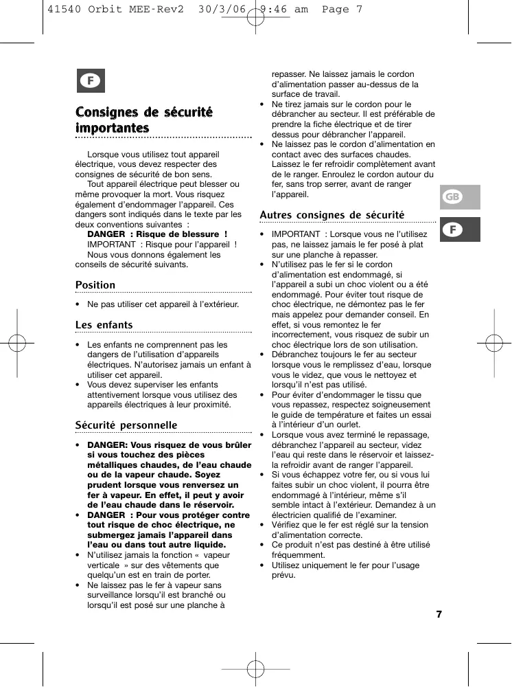 Fer à repasser de voyage Orbit f Merci de bien vouloir lire et conserver ces instructions Orbit-Reisebügeleisen d