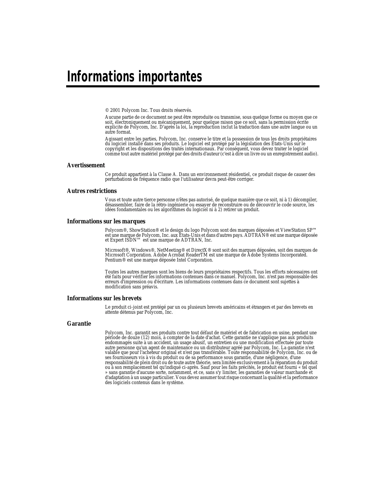 Polycom®, ShowStation® et le design du logo Polycom sont des marques déposées et ViewStation SP™ est une marque de Polycom, Inc. aux États-Unis et dans d'autres pays. ADTRAN et Expert ISDN™ est une marque de ADTRAN, Inc.