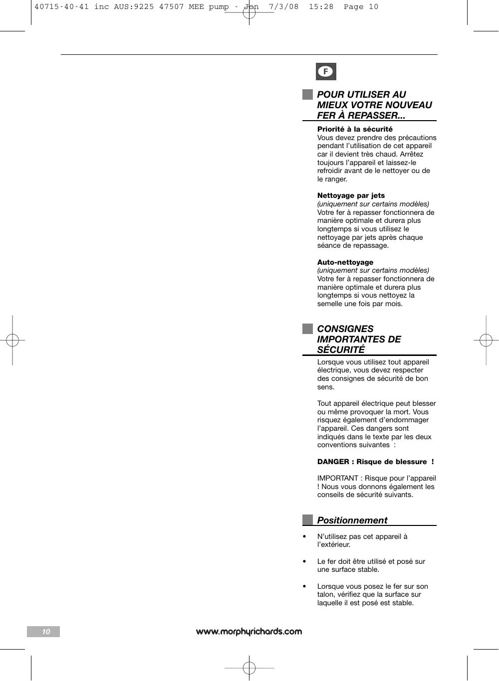 f Les produits Morphy Richards sont conçus pour unusage exclusivement domestique. Morphy Richards s’engage à mener une politique d’amélioration continue en termes de qualité et de conception. Le fabricant se réserve donc le droit de modifier sans préavis la spécification de ses modèles.