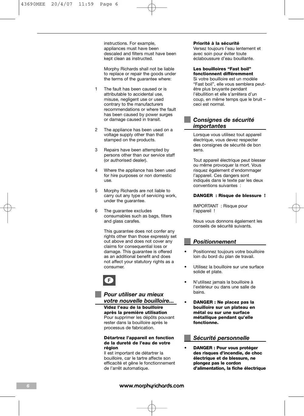 43690MEE 20/4/07 11:59 Page 11 expressément indiqués ci-dessus, et ne couvre aucune réclamation pour dommages immatériels ou indirects. Cette garantie est offerte comme avantage supplémentaire et n’a aucune incidence sur vos droits légaux en tant que consommateur. Pour la clientèle en Belgique Les produits de Morphy Richards sont produits conformément les normes de qualité, agrée international. Au-dessus vos droits légaux, Morphy Richards vous garantit qu’à partir d’achat ce produit sera sans défauts de fabrication ou de matériels pendant une période de deux ans. Il est important de conserver votre bon d’achat comme preuve. Agrafez votre ticket à cette notice d’installation. Si l’appareil a été utilisé sur une alimentation électrique dont la tension est différente de celle qui est indiquée sur l’appareil.