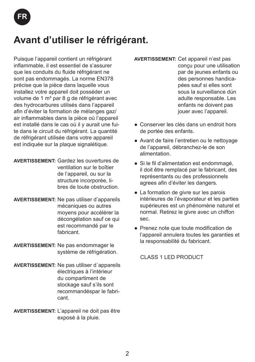 CLASS 1 LED PRODUCT AVERTISSEMENT: Ne pas utiliser d´appareils