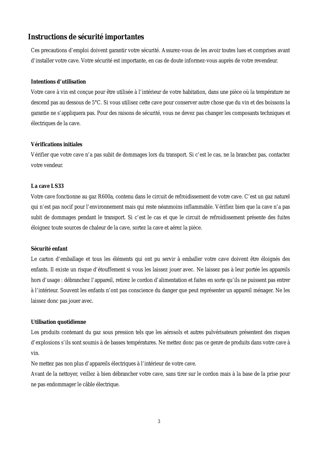 La cave LS33 Votre cave fonctionne au gaz R600a, contenu dans le circuit de refroidissement de votre cave. C’est un gaz naturel qui n’est pas nocif pour l’environnement mais qui reste néanmoins inflammable. Vérifiez bien que la cave n’a pas subit de dommages pendant le transport. Si c’est le cas et que le circuit de refroidissement présente des fuites éloignez toute sources de chaleur de la cave, sortez la cave et aérez la pièce.