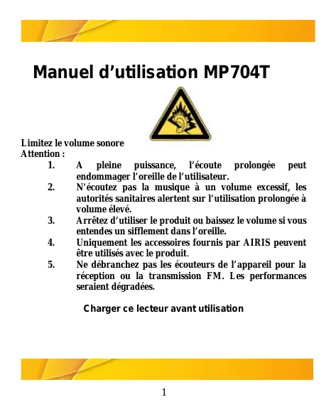 Manuel d’utilisation MP704T Limitez le volume sonore Attention : A pleine puissance, l’écoute prolongée peut endommager l’oreille de l’utilisateur. N’écoutez pas la musique à un volume excessif, les autorités sanitaires alertent sur l’utilisation prolongée à volume élevé. Arrêtez d’utiliser le produit ou baissez le volume si vous entendes un sifflement dans l’oreille. Uniquement les accessoires fournis par AIRIS peuvent être utilisés avec le produit. Ne débranchez pas les écouteurs de l’appareil pour la réception ou la transmission FM. Les performances seraient dégradées. Charger ce lecteur avant utilisation