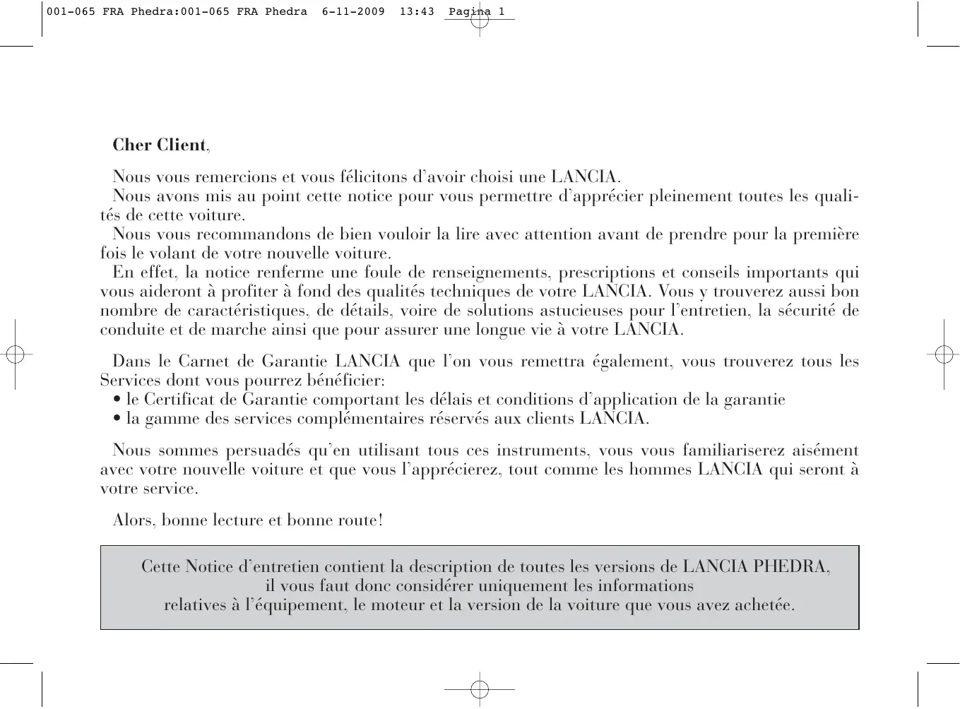 001-065 FRA Phedra:001-065 FRA Phedra 6-11-2009 13:43 Pagina 1 Cher Client, Nous vous remercions et vous félicitons d’avoir choisi une LANCIA. Nous avons mis au point cette notice pour vous permettre d’apprécier pleinement toutes les qualités de cette voiture. Nous vous recommandons de bien vouloir la lire avec attention avant de prendre pour la première fois le volant de votre nouvelle voiture. En effet, la notice renferme une foule de renseignements, prescriptions et conseils importants qui vous aideront à profiter à fond des qualités techniques de votre LANCIA. Vous y trouverez aussi bon nombre de caractéristiques, de détails, voire de solutions astucieuses pour l’entretien, la sécurité de conduite et de marche ainsi que pour assurer une longue vie à votre LANCIA. Dans le Carnet de Garantie LANCIA que l’on vous remettra également, vous trouverez tous les Services dont vous pourrez bénéficier: