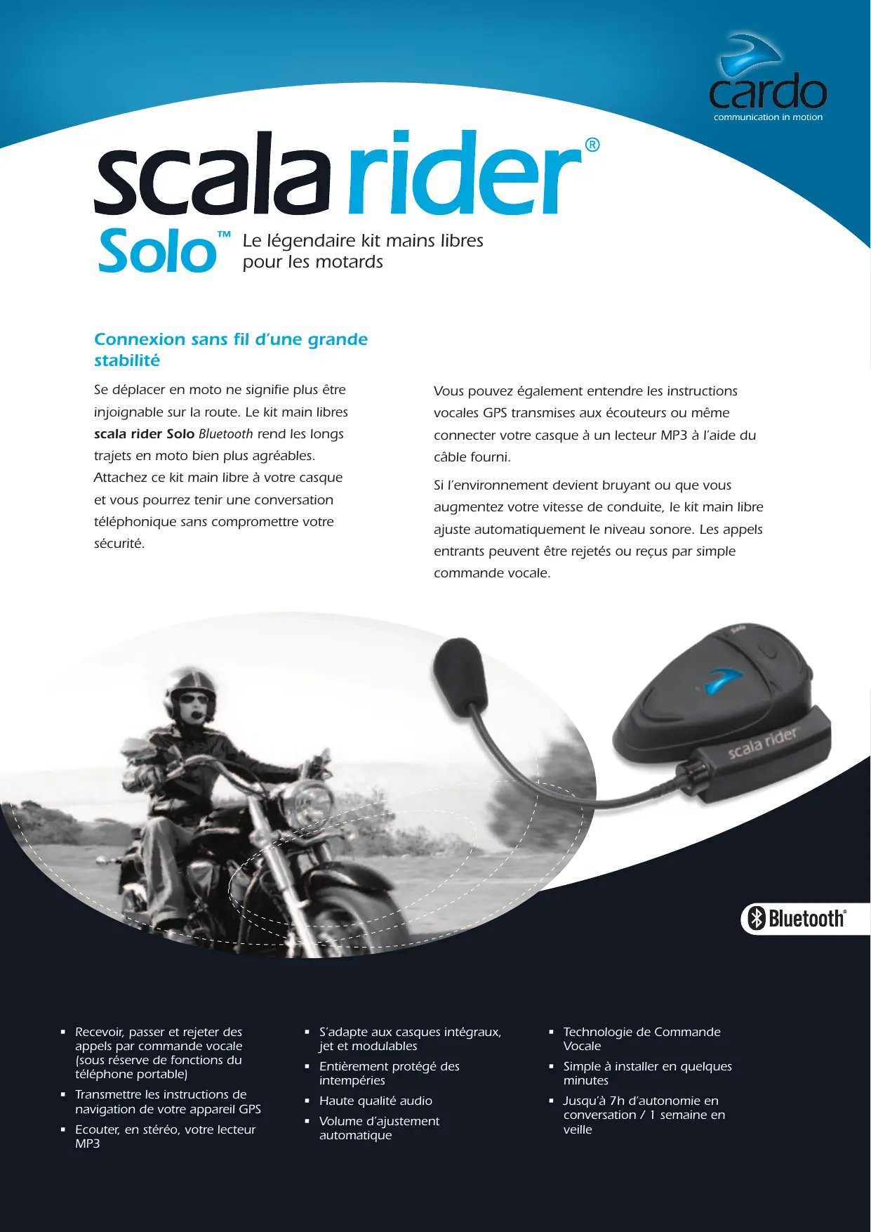scala Le légendaire kit mains libres pour les motards Se déplacer en moto ne signifie plus être injoignable sur la route. Le kit main libres scala rider Solo Bluetooth rend les longs trajets en moto bien plus agréables. Attachez ce kit main libre à votre casque et vous pourrez tenir une conversation téléphonique sans compromettre votre sécurité. Recevoir, passer et rejeter des appels par commande vocale {sous réserve de fonctions du téléphone portable] Transmettre les instructions de navigation de votre appareil GPS Ecouter, en stéré MP3 , votre lecteur câble fourni. entrants peuvent être rejetés ou reçus par simple commande vocale. S'adapte aux casques intégraux, jet et modulables Entièrement protégé des intempéries Haute qualité audio Volume d'ajustement automatique cardo Vous pouvez également entendre les instructions vocales GPS transmises aux écouteurs ou même Si l'environnement devient bruyant ou que vous Technologie de Commande Vocale Simple à installer en quelques minutes Jusqu'à 7h d'autonomie en conversation / 1 semaine en veille connecter votre casque à un lecteur MP3 à l'aide du augmentez votre vitesse de conduite, le kit main libre ajuste automatiquement le niveau sonore. Les appels @ Bluetooth