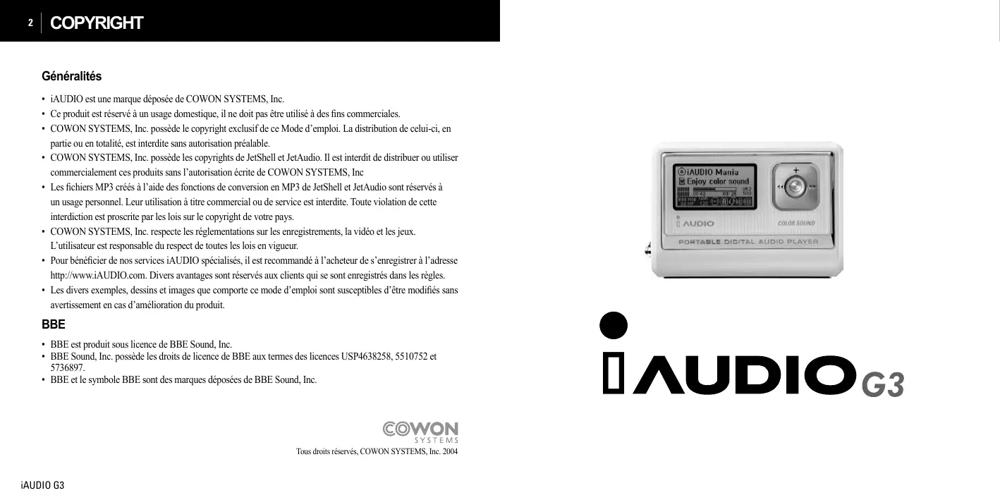 - BBE et le symbole BBE sont des marques déposées de BBE Sound, Inc. Tous droits réservés, COWON SYSTEMS, Inc. 2004 iAUDIO G3