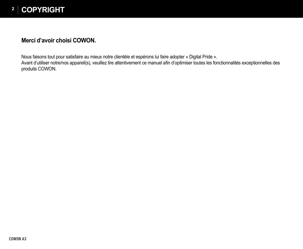 COPYRIGHT Merci d’avoir choisi COWON. Nous faisons tout pour satisfaire au mieux notre clientèle et espérons lui faire adopter « Digital Pride ». Avant d’utiliser notre/nos appareil(s), veuillez lire attentivement ce manuel afin d’optimiser toutes les fonctionnalités exceptionnelles des produits COWON. COWON A3