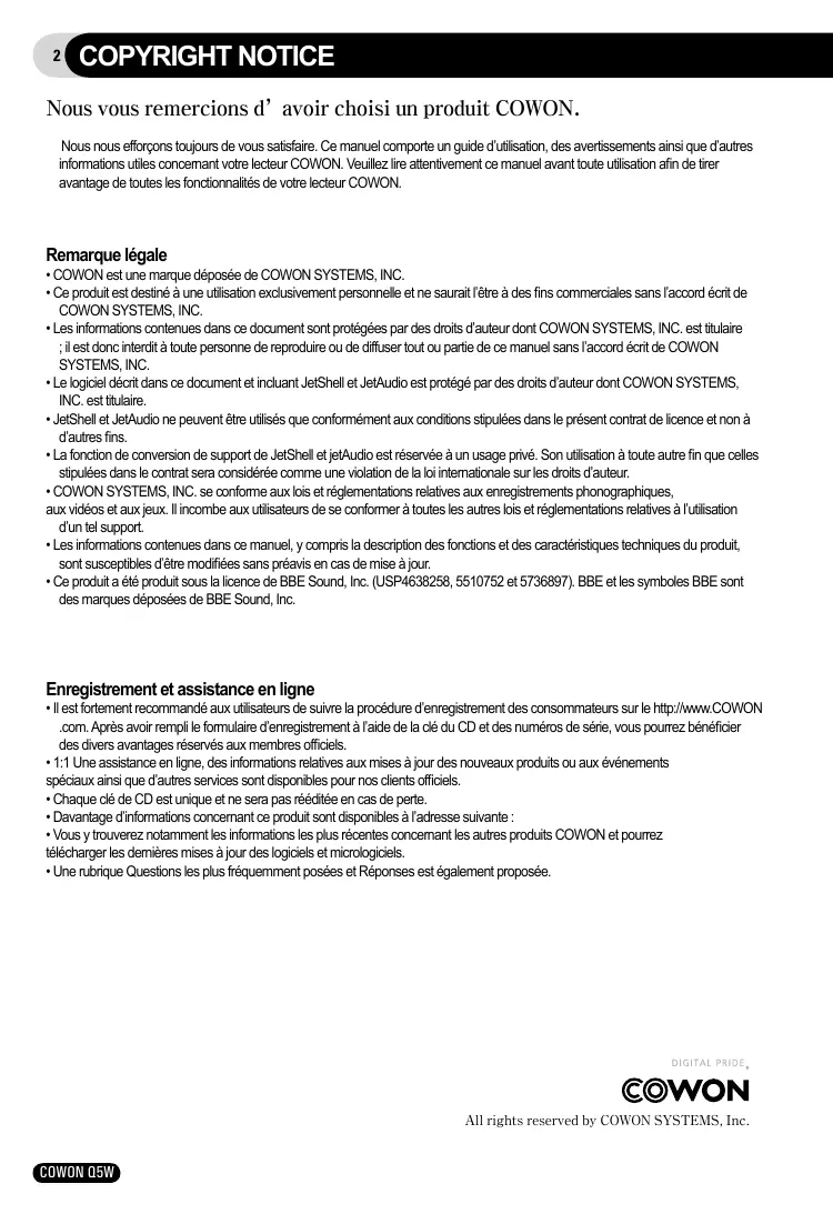 COPYRIGHT NOTICE Nous vous remercions d’avoir choisi un produit COWON. Nous nous efforçons toujours de vous satisfaire. Ce manuel comporte un guide d’utilisation, des avertissements ainsi que d’autres informations utiles concernant votre lecteur COWON. Veuillez lire attentivement ce manuel avant toute utilisation afin de tirer avantage de toutes les fonctionnalités de votre lecteur COWON. Remarque légale