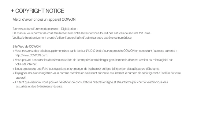 Manuel d’instructionss ver. 1.1FR + COPYRIGHT NOTICE Merci d’avoir choisi un appareil COWON. Bienvenue dans l’univers du concept « Digital pride » Ce manuel vous permet de vous familiariser avec votre lecteur et vous fournit des astuces de sécurité fort utiles. Veuillez le lire attentivement avant d’utiliser l’appareil afin d’optimiser votre expérience numérique. Site Web de COWON + Vous trouverez des détails supplémentaires sur le lecteur iAUDIO 9 et d’autres produits COWON en consultant l’adresse suivante : http://www.COWON.com. + Vous pouvez consulter les dernières actualités de l’entreprise et télécharger gratuitement la dernière version du micrologiciel sur notre site internet. + Nous proposons une Foire aux questions et un manuel de l’utilisateur en ligne à l’intention des utilisateurs débutants. + Rejoignez-nous et enregistrez-vous comme membre en saisissant sur notre site Internet le numéro de série figurant à l’arrière de votre appareil. + En tant que membre, vous pouvez bénéficier de consultations directes en ligne et être informé par courrier électronique des actualités et des événements récents. + COPYRIGHT NOTICE Généralités + COWON est une marque déposée de COWON SYSTEMS, Inc. + Les informations contenues dans ce manuel sont la propriété exclusive de COWON SYSTEMS, Inc. ; il est donc interdit de distribuer tout ou partie de ce manuel sans autorisation préalable. + COWON SYSTEMS, Inc. se conforme aux lois et réglementations relatives aux enregistrements, aux vidéos et aux jeux. Il incombe à l’utilisateur de respecter toutes les lois et réglementations afférentes. + Rendez-vous sur notre site http://www.COWON.com et rejoignez-nous en tant que membre. Vous pourrez alors bénéficier d’avantages réservés uniquement aux membres enregistrés. + Les illustrations, graphiques, photos et spécifications du produit contenus dans ce manuel peuvent faire l’objet de modifications ou de mises à jour sans préavis. À propos de BBE + Cet appareil est produit sous la licence de BBE Sound, Inc. (USP4638258, 5510752 et 5736897). + BBE et les symboles BBE sont des marques déposées de BBE Sound, Inc. All rights reserved by COWON SYSTEMS, Inc. + Sommaire Avant de commencer ! Précautions Contenu de l’emballage Noms des pièces et fonctions Charge Branchement et débranchement de l’ordinateur Mise à jour du micrologiciel Utilisation de base Touches Affichage Navigateur Mode Musique Mode Vidéo Mode Images (Afficheur d’images) Mode Documents (Afficheur de texte) Mode Radio (radio FM) Mode Enregistreur Mode Flash