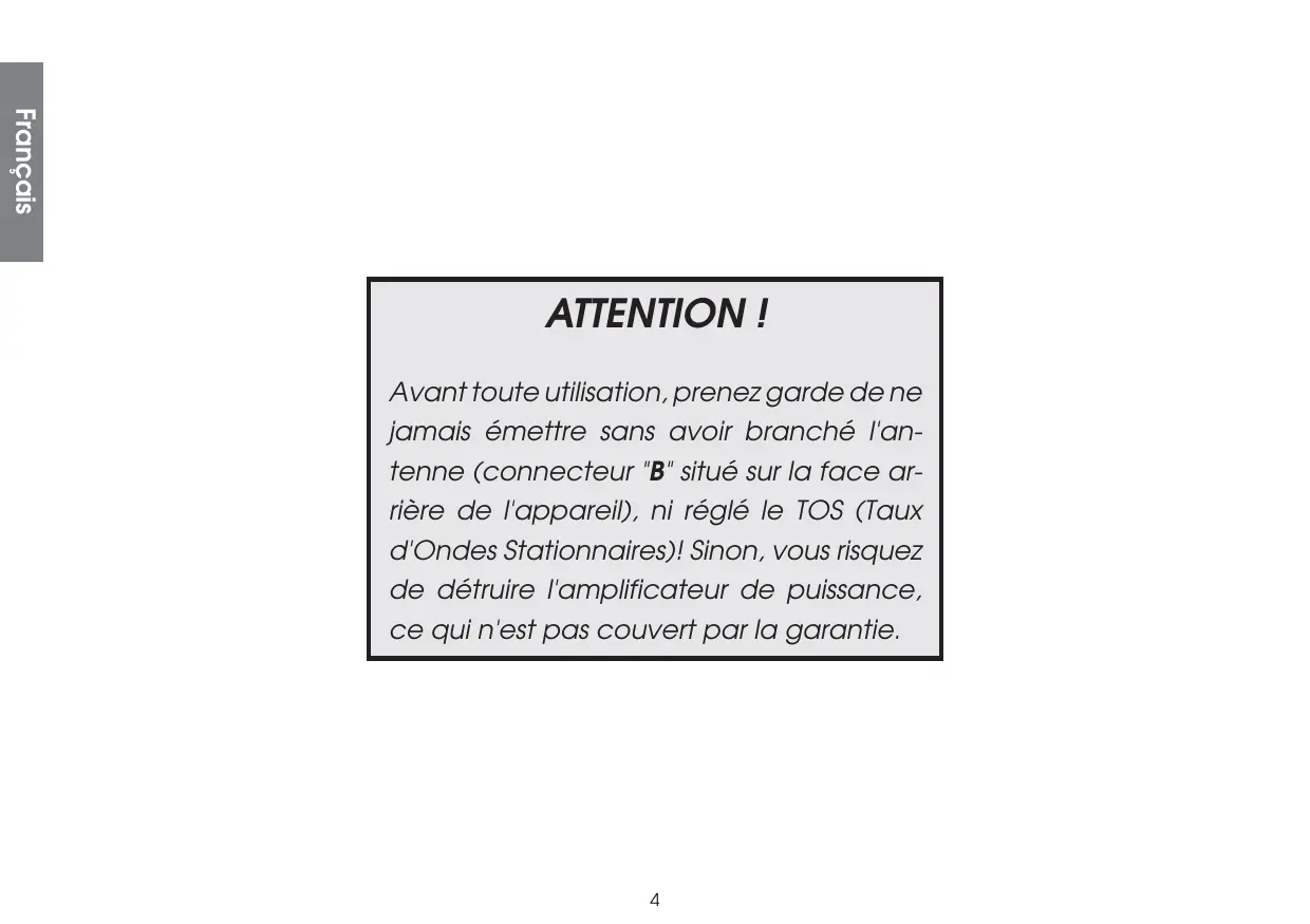 Français ATTENTION ! Avant toute utilisation, prenez garde de ne jamais émettre sans avoir branché l'antenne (connecteur "B" situé sur la face arrière de l'appareil), ni réglé le TOS (Taux d'Ondes Stationnaires)! Sinon, vous risquez de détruire l'amplificateur de puissance, ce qui n'est pas couvert par la garantie.