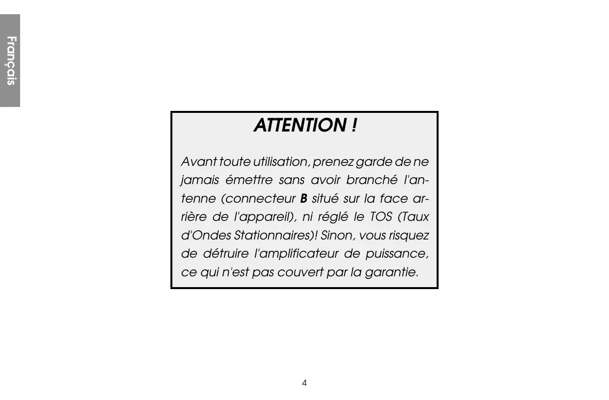 Votre PRESIDENT New JIMMY en un coup d'œil ATTENTION ! Avant toute utilisation, prenez garde de ne jamais émettre sans avoir branché l'antenne (connecteur B situé sur la face arrière de l'appareil), ni réglé le TOS (Taux d'Ondes Stationnaires)! Sinon, vous risquez de détruire l'amplificateur de puissance, ce qui n'est pas couvert par la garantie.