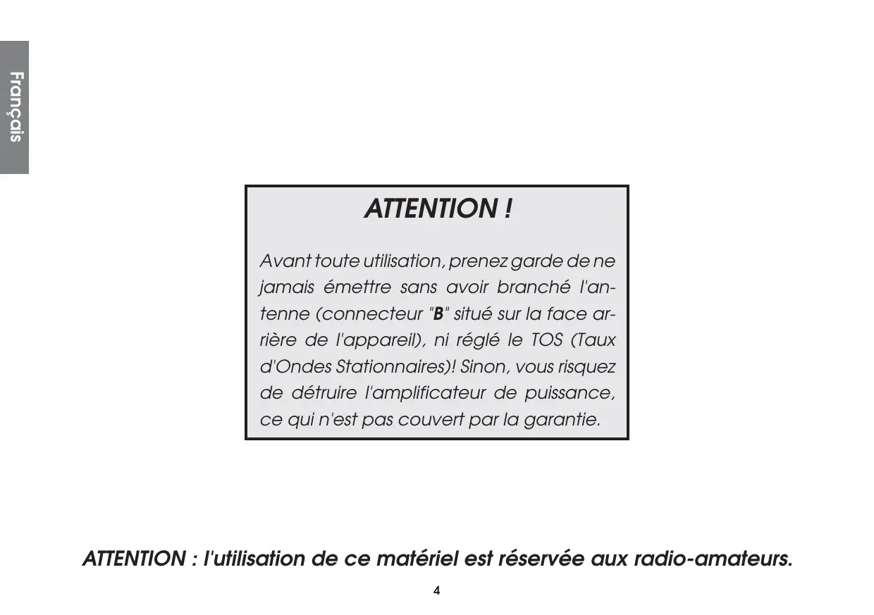 Français ATTENTION ! Avant toute utilisation, prenez garde de ne jamais émettre sans avoir branché l'antenne (connecteur "B" situé sur la face arrière de l'appareil), ni réglé le TOS (Taux d'Ondes Stationnaires)! Sinon, vous risquez de détruire l'amplificateur de puissance, ce qui n'est pas couvert par la garantie. ATTENTION : l'utilisation de ce matériel est réservée aux radio-amateurs.