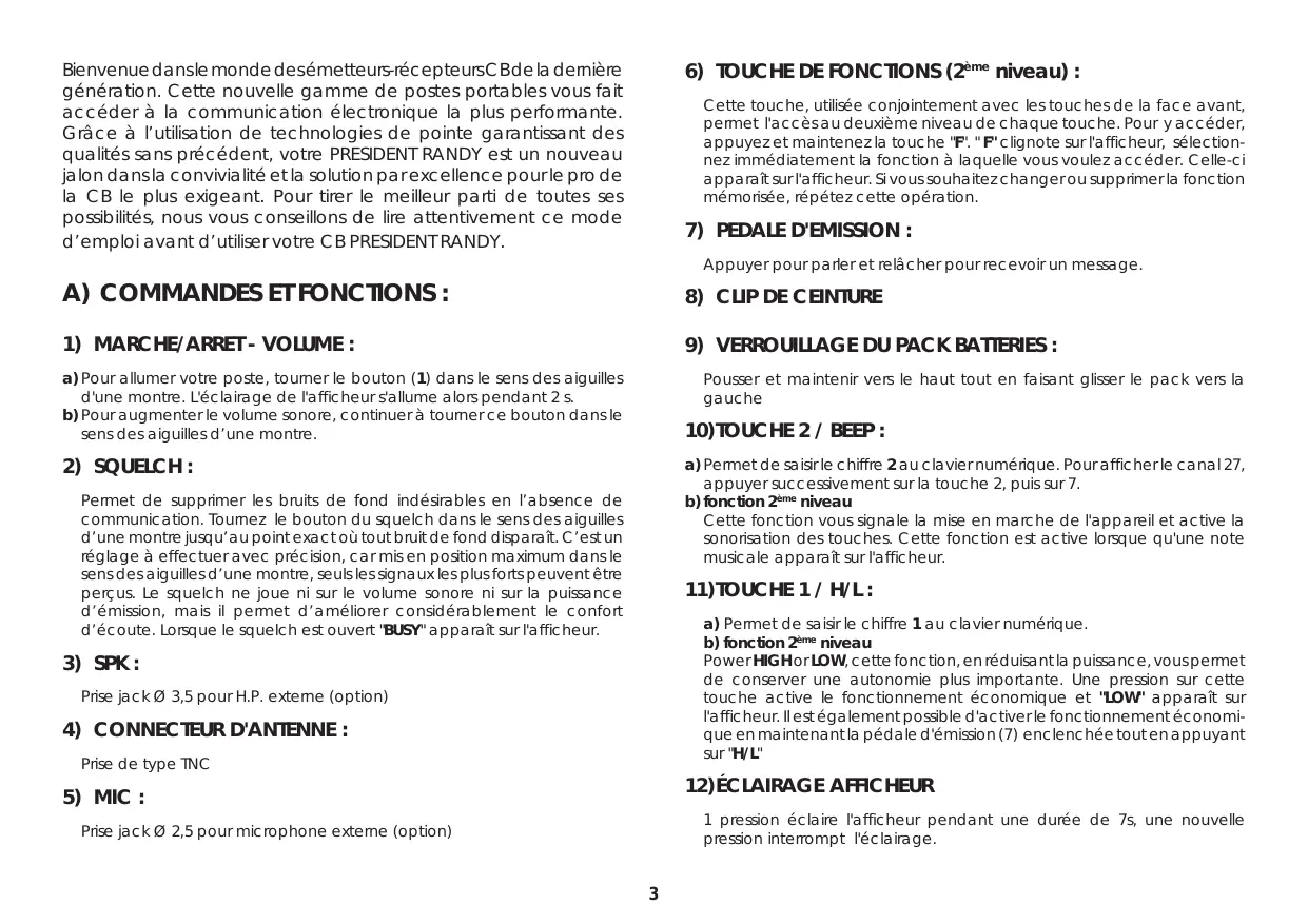 Bienvenue dans le monde des émetteurs-récepteurs CB de la dernière génération. Cette nouvelle gamme de postes portables vous fait accéder à la communication électronique la plus performante. Grâce à l’utilisation de technologies de pointe garantissant des qualités sans précédent, votre PRESIDENT RANDY est un nouveau jalon dans la convivialité et la solution par excellence pour le pro de la CB le plus exigeant. Pour tirer le meilleur parti de toutes ses possibilités, nous vous conseillons de lire attentivement ce mode d’emploi avant d’utiliser votre CB PRESIDENT RANDY. Cette touche, utilisée conjointement avec les touches de la face avant, permet l'accès au deuxième niveau de chaque touche. Pour y accéder, appuyez et maintenez la touche "F". " F" clignote sur l'afficheur, sélectionnez immédiatement la fonction à laquelle vous voulez accéder. Celle-ci apparaît sur l'afficheur. Si vous souhaitez changer ou supprimer la fonction mémorisée, répétez cette opération.