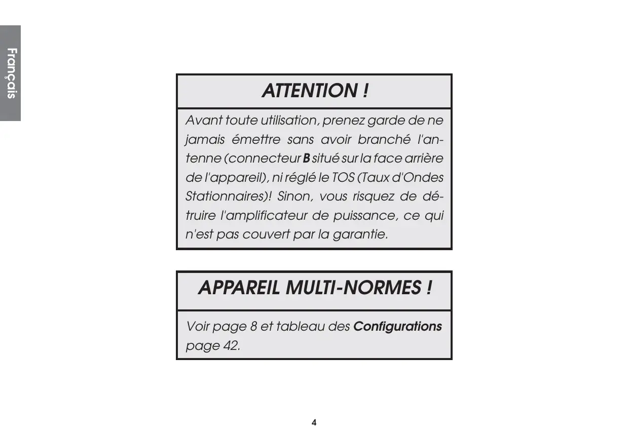 Français ATTENTION ! Avant toute utilisation, prenez garde de ne jamais émettre sans avoir branché l'antenne (connecteur B situé sur la face arrière de l'appareil), ni réglé le TOS (Taux d'Ondes Stationnaires)! Sinon, vous risquez de détruire l'amplificateur de puissance, ce qui n'est pas couvert par la garantie. APPAREIL MULTI-NORMES ! Voir page 8 et tableau des Configurations page 42.