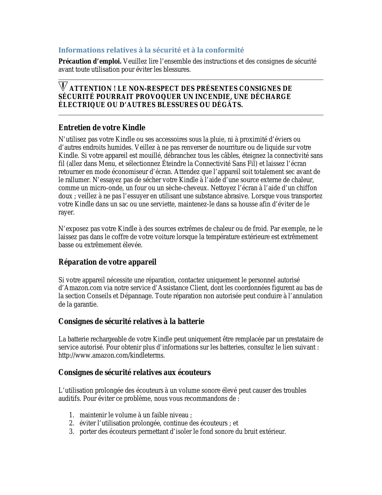 Informations relatives à la sécurité et à la conformité Précaution d’emploi. Veuillez lire l’ensemble des instructions et des consignes de sécurité avant toute utilisation pour éviter les blessures. ATTENTION ! LE NON-RESPECT DES PRÉSENTES CONSIGNES DE SÉCURITÉ POURRAIT PROVOQUER UN INCENDIE, UNE DÉCHARGE ÉLECTRIQUE OU D’AUTRES BLESSURES OU DÉGÂTS. Entretien de votre Kindle N’utilisez pas votre Kindle ou ses accessoires sous la pluie, ni à proximité d’éviers ou d’autres endroits humides. Veillez à ne pas renverser de nourriture ou de liquide sur votre Kindle. Si votre appareil est mouillé, débranchez tous les câbles, éteignez la connectivité sans fil (allez dans Menu, et sélectionnez Éteindre la Connectivité Sans Fil) et laissez l’écran retourner en mode économiseur d’écran. Attendez que l’appareil soit totalement sec avant de le rallumer. N’essayez pas de sécher votre Kindle à l’aide d’une source externe de chaleur, comme un micro-onde, un four ou un sèche-cheveux. Nettoyez l’écran à l’aide d’un chiffon doux ; veillez à ne pas l’essuyer en utilisant une substance abrasive. Lorsque vous transportez votre Kindle dans un sac ou une serviette, maintenez-le dans sa housse afin d’éviter de le rayer. N’exposez pas votre Kindle à des sources extrêmes de chaleur ou de froid. Par exemple, ne le laissez pas dans le coffre de votre voiture lorsque la température extérieure est extrêmement basse ou extrêmement élevée. Réparation de votre appareil Si votre appareil nécessite une réparation, contactez uniquement le personnel autorisé d’Amazon.com via notre service d’Assistance Client, dont les coordonnées figurent au bas de la section Conseils et Dépannage. Toute réparation non autorisée peut conduire à l’annulation de la garantie. Consignes de sécurité relatives à la batterie La batterie rechargeable de votre Kindle peut uniquement être remplacée par un prestataire de service autorisé. Pour obtenir plus d’informations sur les batteries, consultez le lien suivant : http://www.amazon.com/kindleterms. Consignes de sécurité relatives aux écouteurs L’utilisation prolongée des écouteurs à un volume sonore élevé peut causer des troubles auditifs. Pour éviter ce problème, nous vous recommandons de :