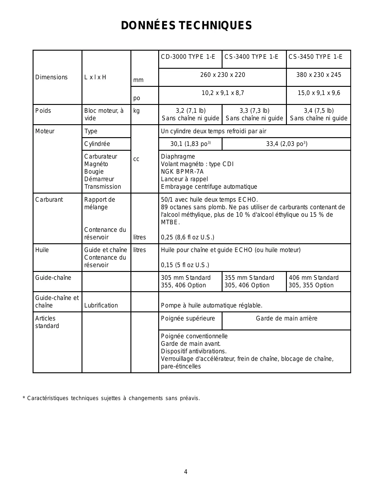 | Huile | Guide et chaineContenance du réservoir | litres | Huile pour chaine et guide ECHO (ou huile moteur)0,15 (5 fl oz U.S.) | ||