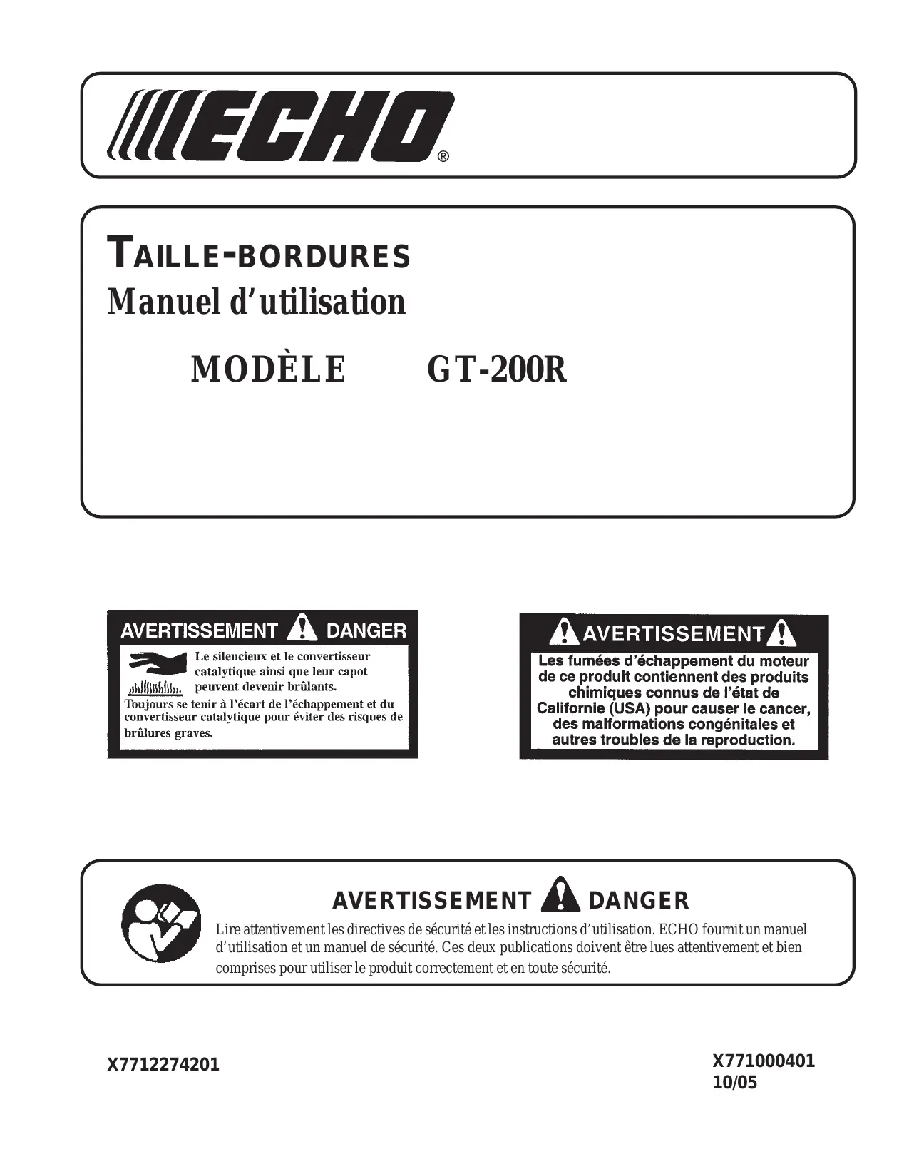 =. | Le silencieux et le convertisseur Les fumées d'échappement du moteur catalytique ainsi que leur capot de ce produit contiennent des produits sslsbltn. peuvent devenir brûlants. oui tenir à l'écart de l'écha tet à chimiques connus de l’état de foujours se tenir à l'écart de l’échappement et du convertisseur catalytique pour éviter des risques de Ce melon lions corn enltales ee? brûlures graves. autres troubles de la reproduction. AVERTISSEMENT À DANGER Lire attentivement les directives de sécurité et les instructions d'utilisation. ECHO fournit un manuel d'utilisation et un manuel de sécurité. Ces deux publications doivent être lues attentivement et bien comprises pour utiliser le produit correctement et en toute sécurité. X7712274201 X771000401 10/05