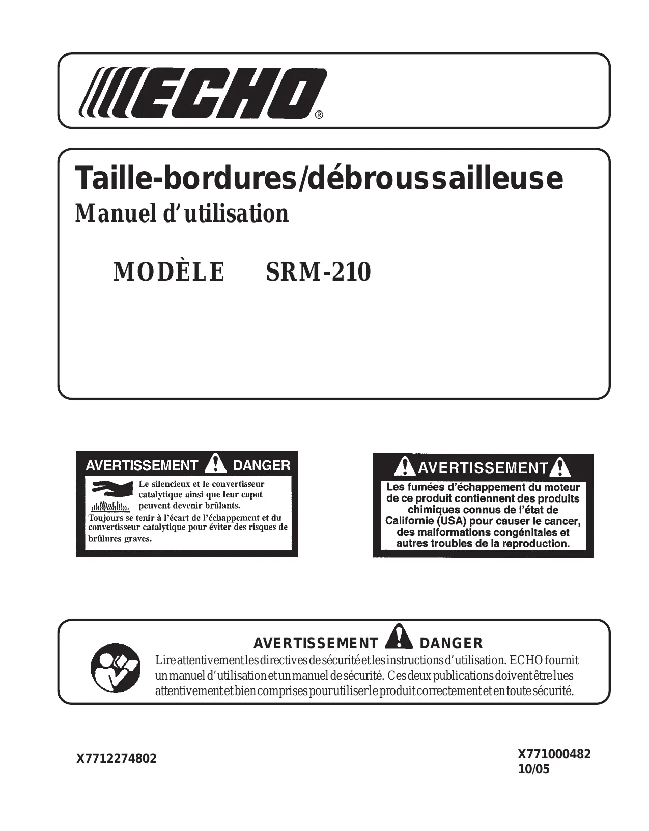 =. | Le silencieux et le convertisseur talytique ainsi que leur capot Les fumées d'échappement du moteur sl, peuvent devenir Hrûlants. de ce produit contiennent des produits chimiques connus de l’état de Toujours se tenir à l'écart de l’échappement et du convertisseur catalytique pour éviter des risques de Californie (USA) pour causer le cancer, brûlures graves. des malformations congénitales et autres troubles de la reproduction. AVERTISSEMENT À DANGER Lireattentivementlesdirectives desécuritéetlesinstructions d'utilisation. ECHO fournit unmanuel d'utilisation etun manuel desécurité. Ces deux publications doiventêtrelues attentivementetbien comprises pourutiliserle produitcorrectementeten toute sécurité. X7712274802 X771000482 10/05