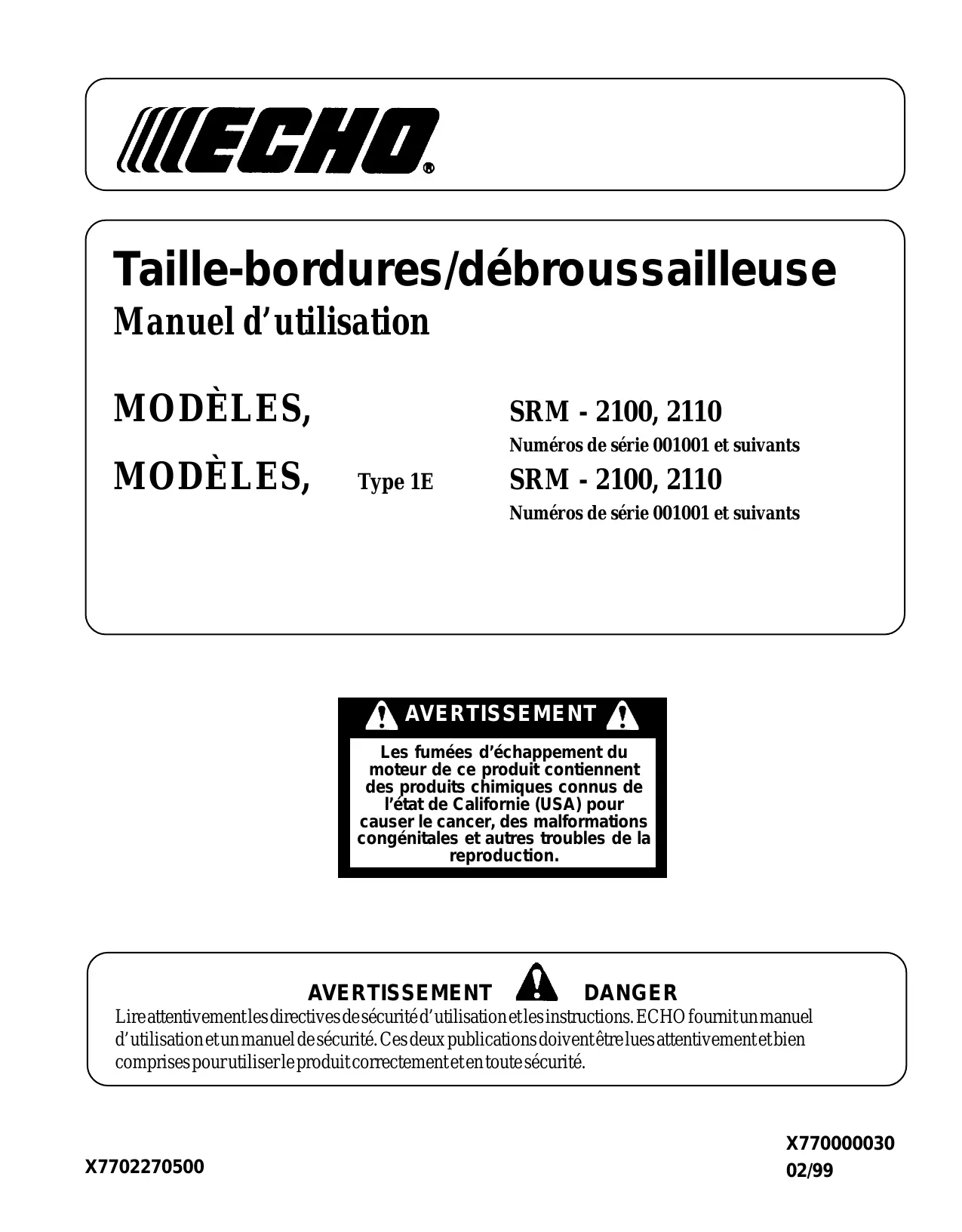 Taille-bordures/débroussailleuse Manuel d’utilisation MODÈLES, SRM - 2100, 2110 Numéros de série 001001 et suivants MODÈLES, Type 1E SRM - 2100, 2110 Numéros de série 001001 et suivants AVERTISSEMENT Les fumées d’échappement du moteur de ce produit contiennent des produits chimiques connus de l’état de Californie (USA) pour causer le cancer, des malformations congénitales et autres troubles de la reproduction. AVERTISSEMENT DANGER Lire attentivement les directives de sécurité d’utilisation et les instructions. ECHO fournit un manuel d’utilisation et un manuel de sécurité. Ces deux publications doivent être lues attentivement et bien comprises pour utiliser le produit correctement et en toute sécurité. X7702270500 X770000030 02/99