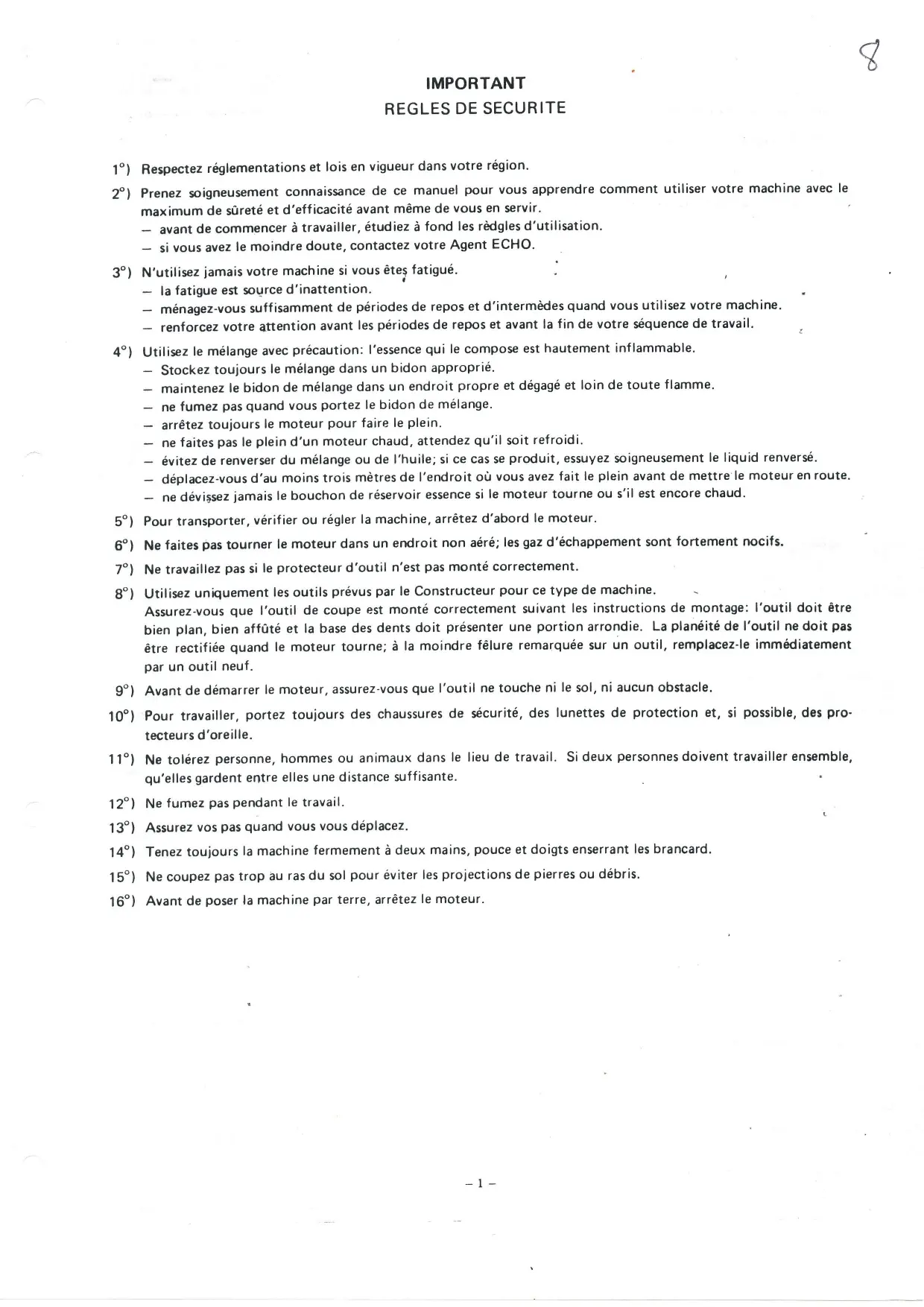 lol Respectez r{llementations et lois en vigueur dans votre région' 2"1 prenez soigneusement connaissance de ce manuel pour vous apprendre comment utiliser votre machine avec le maximum de sÛreté et d'eff icacité avant même de vous en servir. fond les ràJgles d'utilisation. - avant de commencer à travailler, étudiez àvotre Agent ECHO. si vous avez le moindre doute, contactez