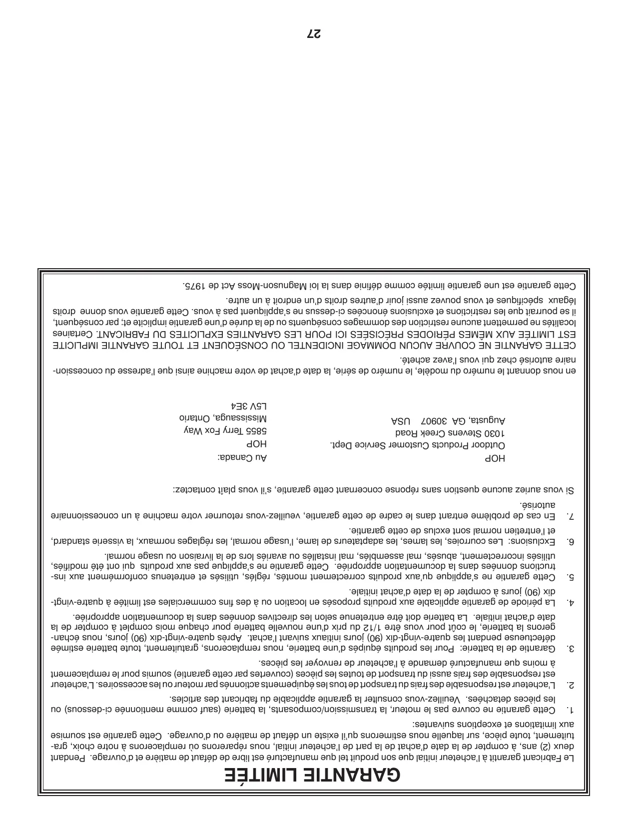 AVERTISSEMENT: Pour éviter de vous blesser gravement, utilisez votre tracteur parallelement à la pente, jamais transversalement. N'affrontez pas de pentes de plus de 15 degrès. Effectuez les virages graduelflement afin d'éviter le renversement ou la perte de contrôle. Soyez extrément prudent quand vous changez de directions sur les pentes.