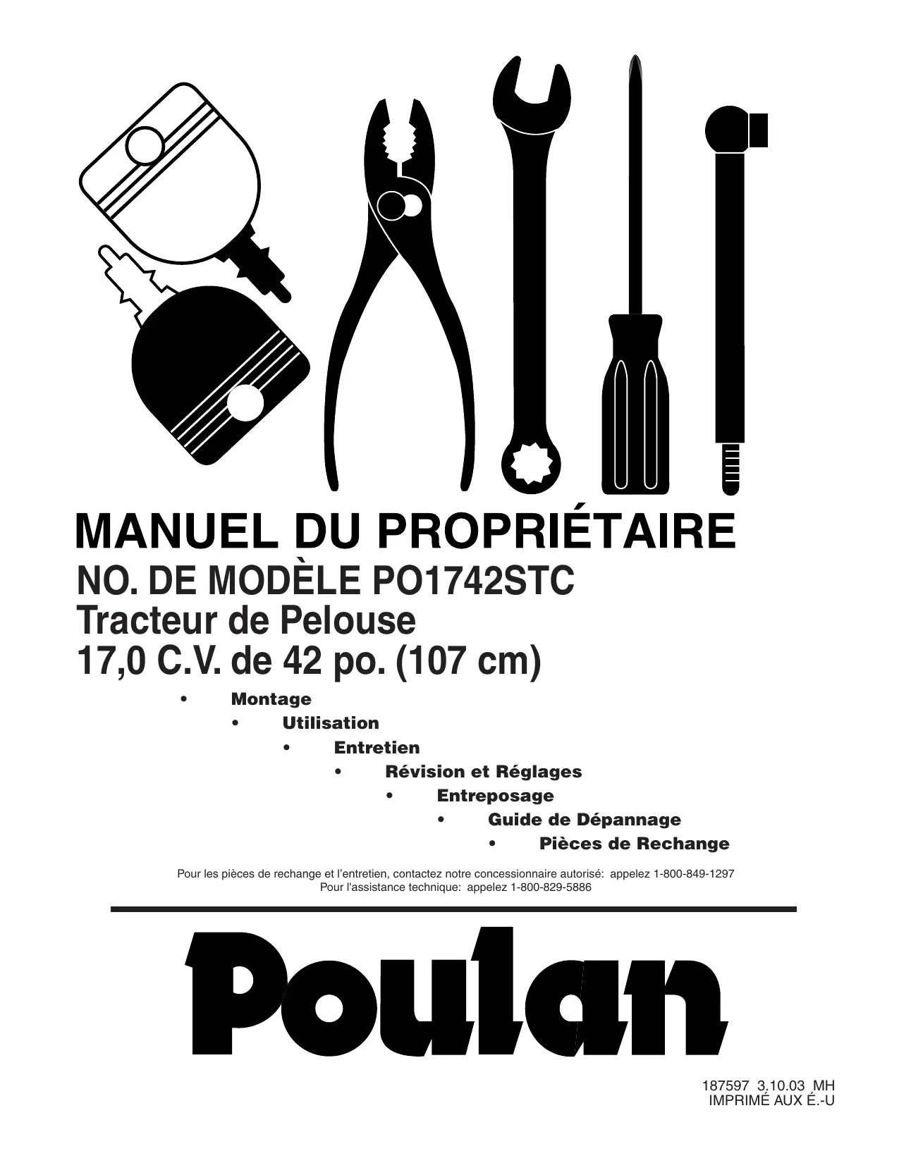 Pour les pieces de rechange et l'entretien, contactez notre concessionnaire autorisé: appelez 1-800-849-1297