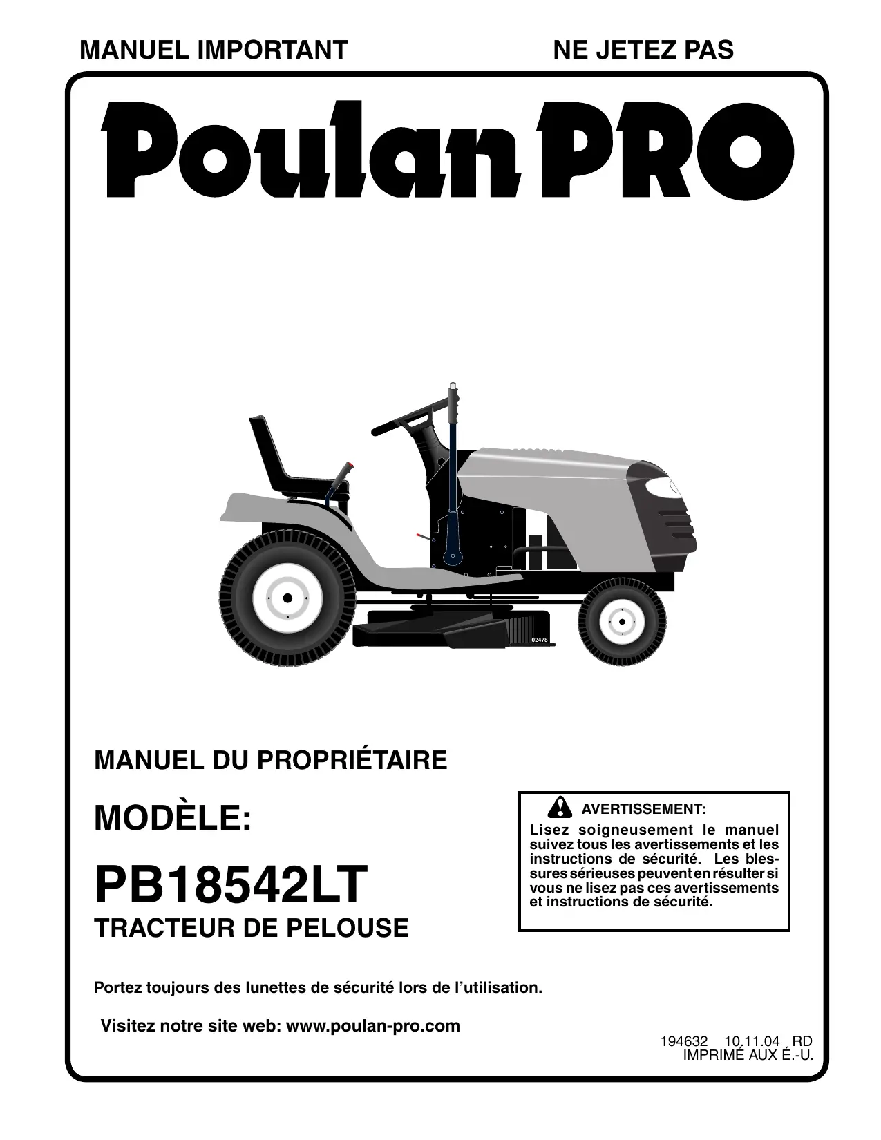Retrouvez gratuitement la notice de l'appareil PRO PB18542LT POULAN au format PDF.