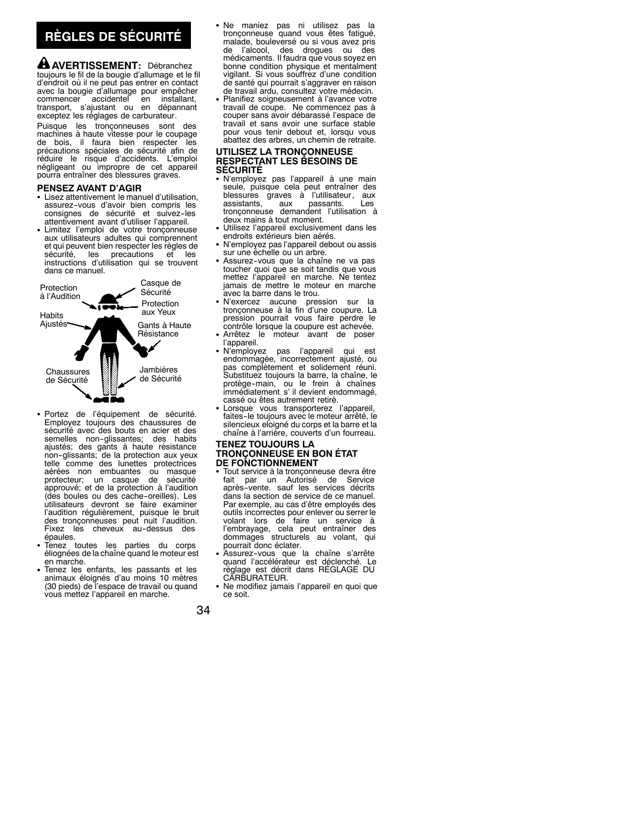 S Lisez attentivement le manuel d’utilisation, assurez--vous d’avoir bien compris les consignes de sécurité et suivez--les attentivement avant d’utiliser l’appareil. S Limitez l’emploi de votre tronçonneuse aux utilisateurs adultes qui comprennent et qui peuvent bien respecter les règles de sécurité, les precautions et les instructions d’utilisation qui se trouvent dans ce manuel. Casque de Protection Sécurité à l’Audition Protection aux Yeux Habits Ajustés Gants à Haute Résistance Chaussures de Sécurité Jambières de Sécurité S Portez de l’équipement de sécurité. Employez toujours des chaussures de sécurité avec des bouts en acier et des semelles non--glissantes; des habits ajustés; des gants à haute résistance non--glissants; de la protection aux yeux telle comme des lunettes protectrices aérées non embuantes ou masque protecteur; un casque de sécurité approuvé; et de la protection à l’audition (des boules ou des cache--oreilles). Les utilisateurs devront se faire examiner l’audition régulièrement, puisque le bruit des tronçonneuses peut nuit l’audition. Fixez les cheveux au--dessus des épaules. S Tenez toutes les parties du corps éliognées de la chaîne quand le moteur est en marche. S Tenez les enfants, les passants et les animaux éloignés d’au moins 10 mètres (30 pieds) de l’espace de travail ou quand vous mettez l’appareil en marche.