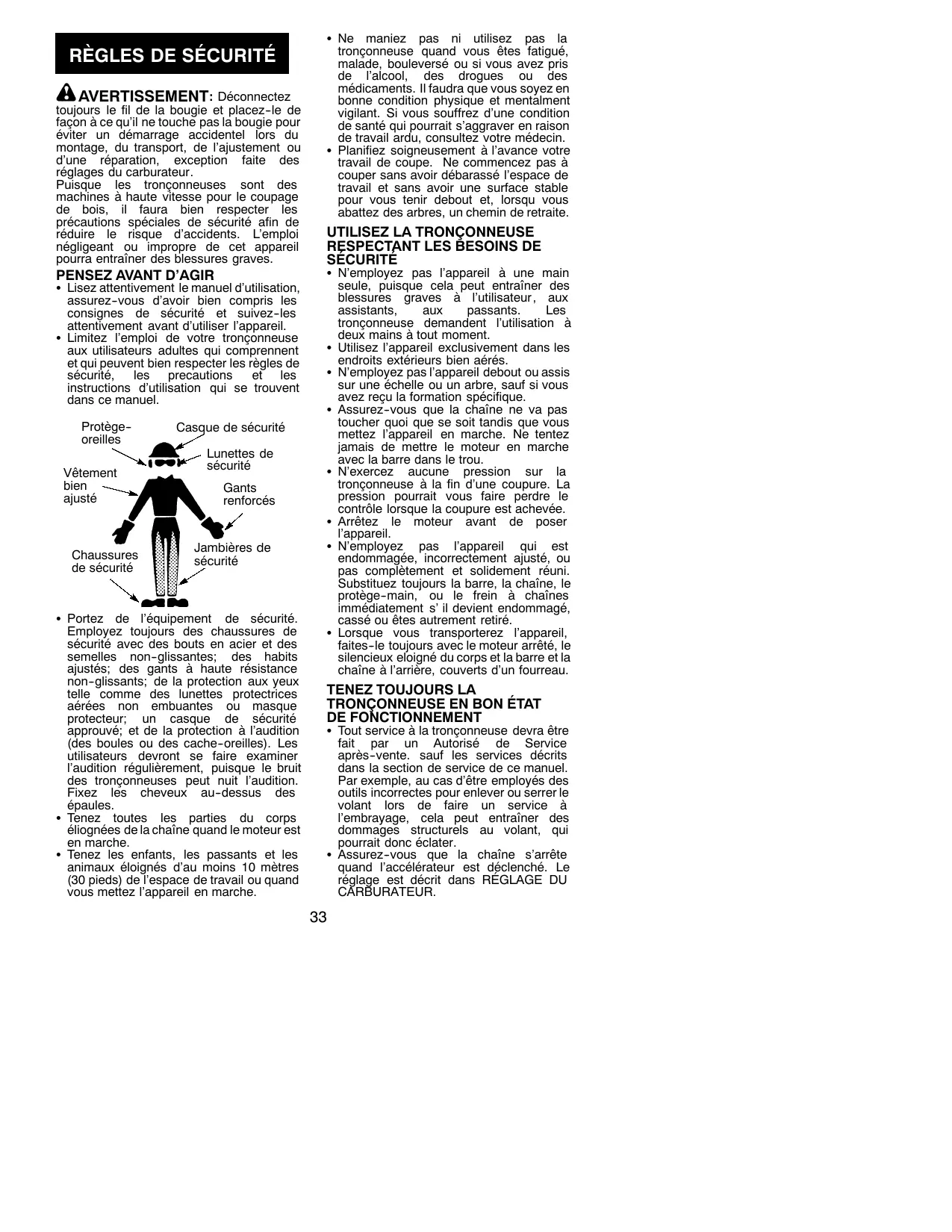 S Lisez attentivement le manuel d’utilisation, assurez--vous d’avoir bien compris les consignes de sécurité et suivez--les attentivement avant d’utiliser l’appareil. S Limitez l’emploi de votre tronçonneuse aux utilisateurs adultes qui comprennent et qui peuvent bien respecter les règles de sécurité, les precautions et les instructions d’utilisation qui se trouvent dans ce manuel. Protège-oreilles Vêtement bien ajusté Chaussures de sécurité Casque de sécurité Lunettes de sécurité Gants renforcés Jambières de sécurité S Portez de l’équipement de sécurité. Employez toujours des chaussures de sécurité avec des bouts en acier et des semelles non--glissantes; des habits ajustés; des gants à haute résistance non--glissants; de la protection aux yeux telle comme des lunettes protectrices aérées non embuantes ou masque protecteur; un casque de sécurité approuvé; et de la protection à l’audition (des boules ou des cache--oreilles). Les utilisateurs devront se faire examiner l’audition régulièrement, puisque le bruit des tronçonneuses peut nuit l’audition. Fixez les cheveux au--dessus des épaules. S Tenez toutes les parties du corps éliognées de la chaîne quand le moteur est en marche. S Tenez les enfants, les passants et les animaux éloignés d’au moins 10 mètres (30 pieds) de l’espace de travail ou quand vous mettez l’appareil en marche. S Ne maniez pas ni utilisez pas la tronçonneuse quand vous êtes fatigué, malade, bouleversé ou si vous avez pris de l’alcool, des drogues ou des médicaments. Il faudra que vous soyez en bonne condition physique et mentalment vigilant. Si vous souffrez d’une condition de santé qui pourrait s’aggraver en raison de travail ardu, consultez votre médecin. S Planifiez soigneusement à l’avance votre travail de coupe. Ne commencez pas à couper sans avoir débarassé l’espace de travail et sans avoir une surface stable pour vous tenir debout et, lorsqu vous abattez des arbres, un chemin de retraite.