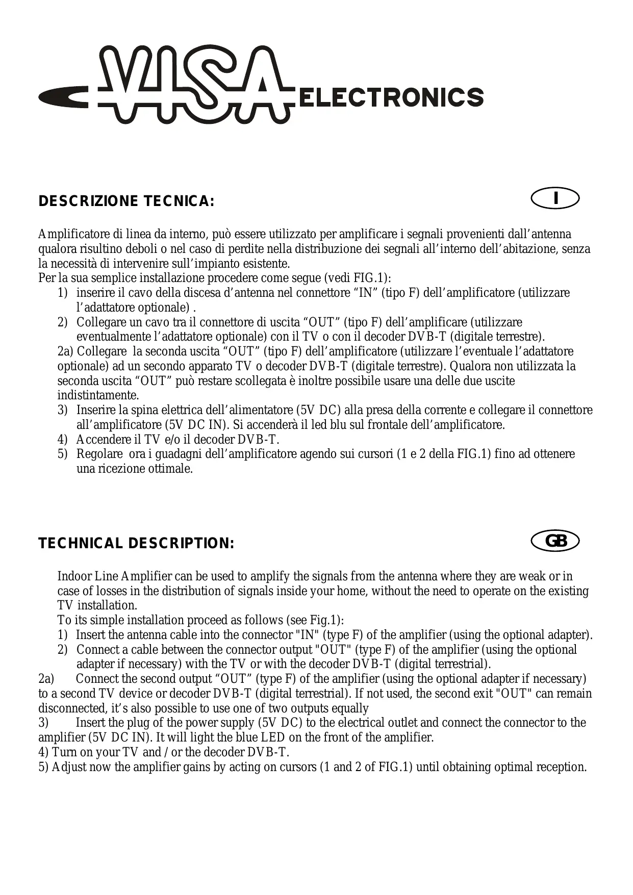 3) Insérez la fiche électrique de l'alimentation (5V DC) à la prise électrique et branchez le connecteur à l'amplificateur (5V DC IN). Une LED bleue s'allumera sur l'amplificateur. 4) Allumez votre TV et / ou le décodeur DVB-T. 5) Régler maintenant les gains de l'amplificateur en agissant avec les curseurs (1 et 2 de FIG.1) jusqu'à l'obtention d'une réception optimale.