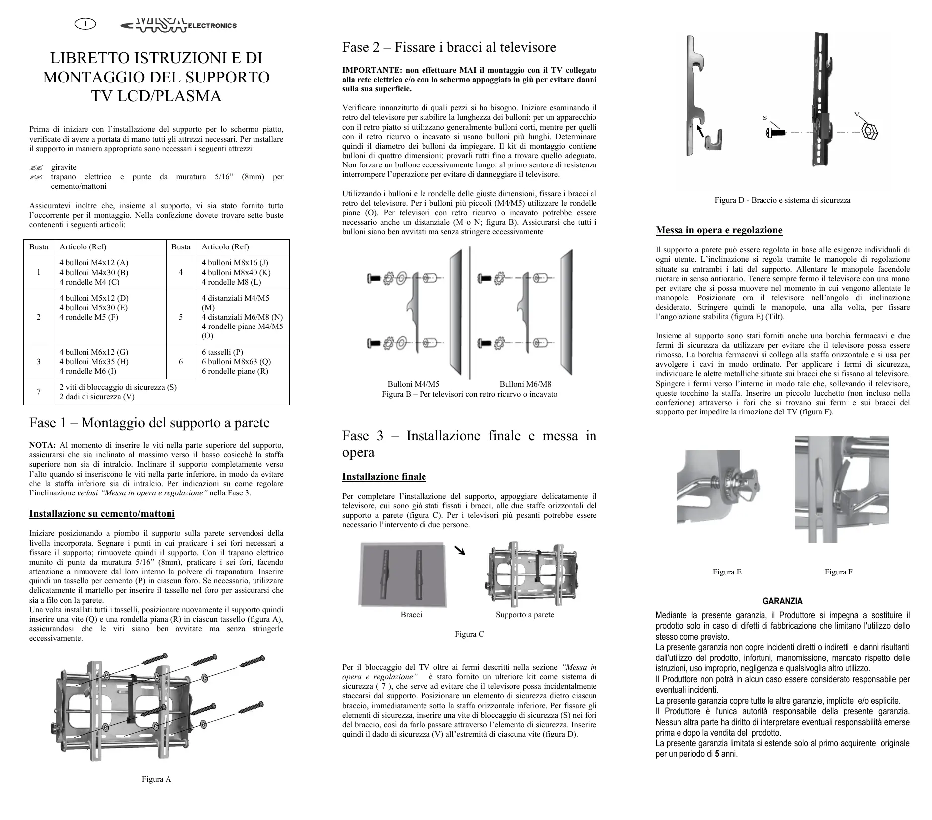 Le support est fourni avec également un passe-câble et deux blocages de sécurité à utiliser pour éviter que le téléviseur ne puisse être sorti de son support. Le passage-câble doit être rattaché à la barre horizontale et utilisé pour rassembler les câbles de façon ordonnée. Pour appliquer les blocages de sécurité, repérer les ailettes métalliques situées sur les bras se fixant au téléviseur. Pousser les blocages vers l'intérieur de façon à ce qu'en bougeant le téléviseur, ils touchent la barre. Insérer un petit cadenas (non fourni avec le produit) à travers les trous situés sur les blocages et sur les bras du support pour empêcher toute séparation du téléviseur de son support (scheme F).