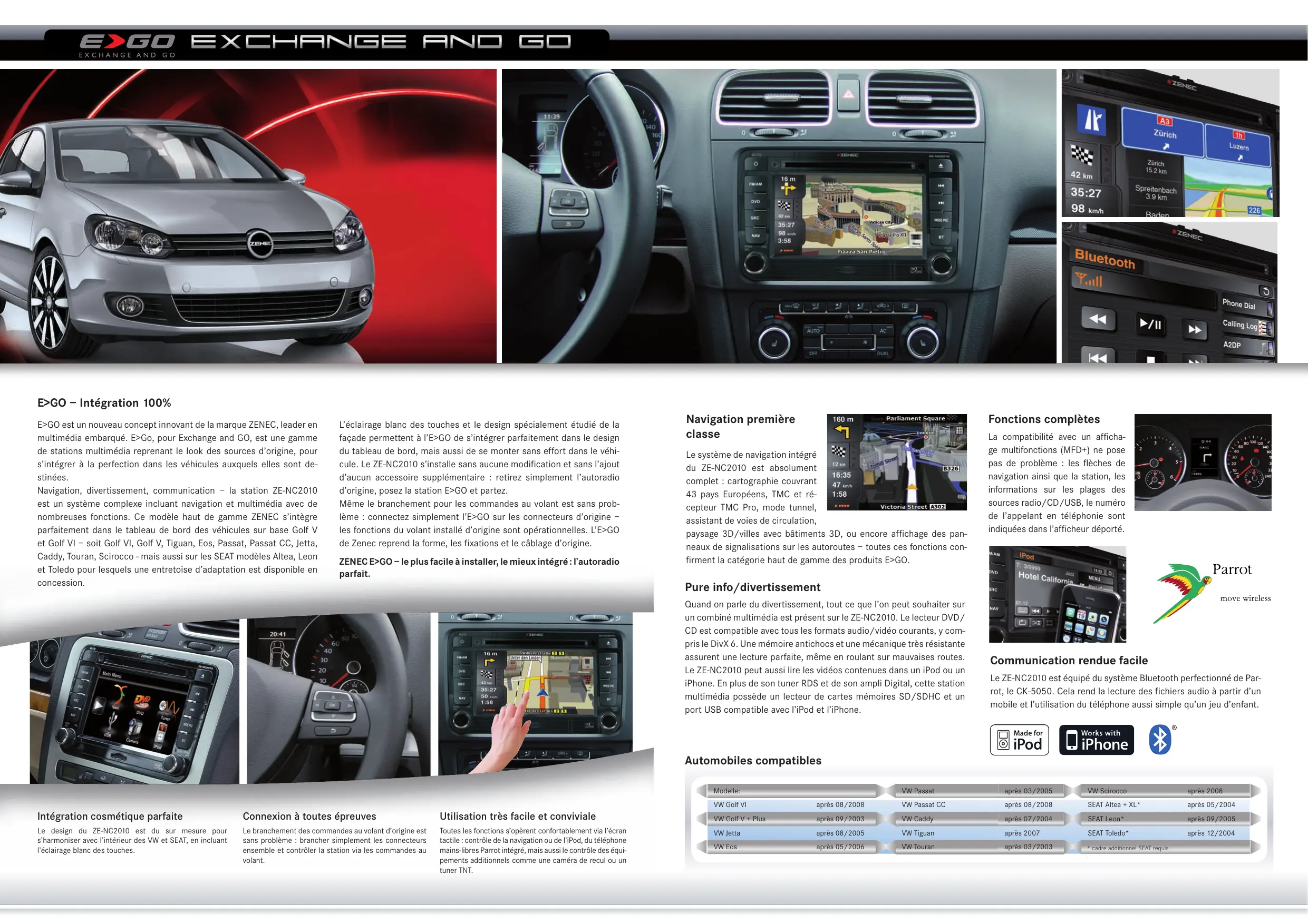 Navigation, divertissement, communication - la station ZE-NC2010 est un système complexe incluant navigation et multimédia avec de nombreuses fonctions. Ce modèle haut de gamme ZENEC s'intègre parfaitement dans le tableau de bord des véhicules sur base Golf V et Golf VI - soit Golf VI, Golf V, Tiguan, Eos, Passat, Passat CC, Jetta, Caddy, Touran, Scirocco - mais aussi sur les SEAT modèles Altea, Leon et Toledo pour lesquels une entrée d'adaptation est disponible en concession.