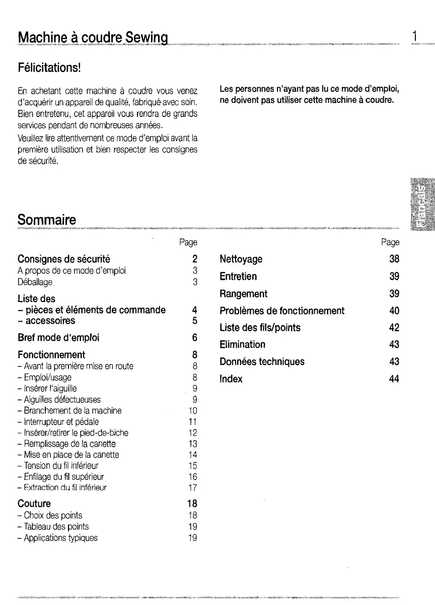 Les personnes n'ayant pas lu ce mode d'emploi, ne doivent pas utiliser cette machine à coudre.