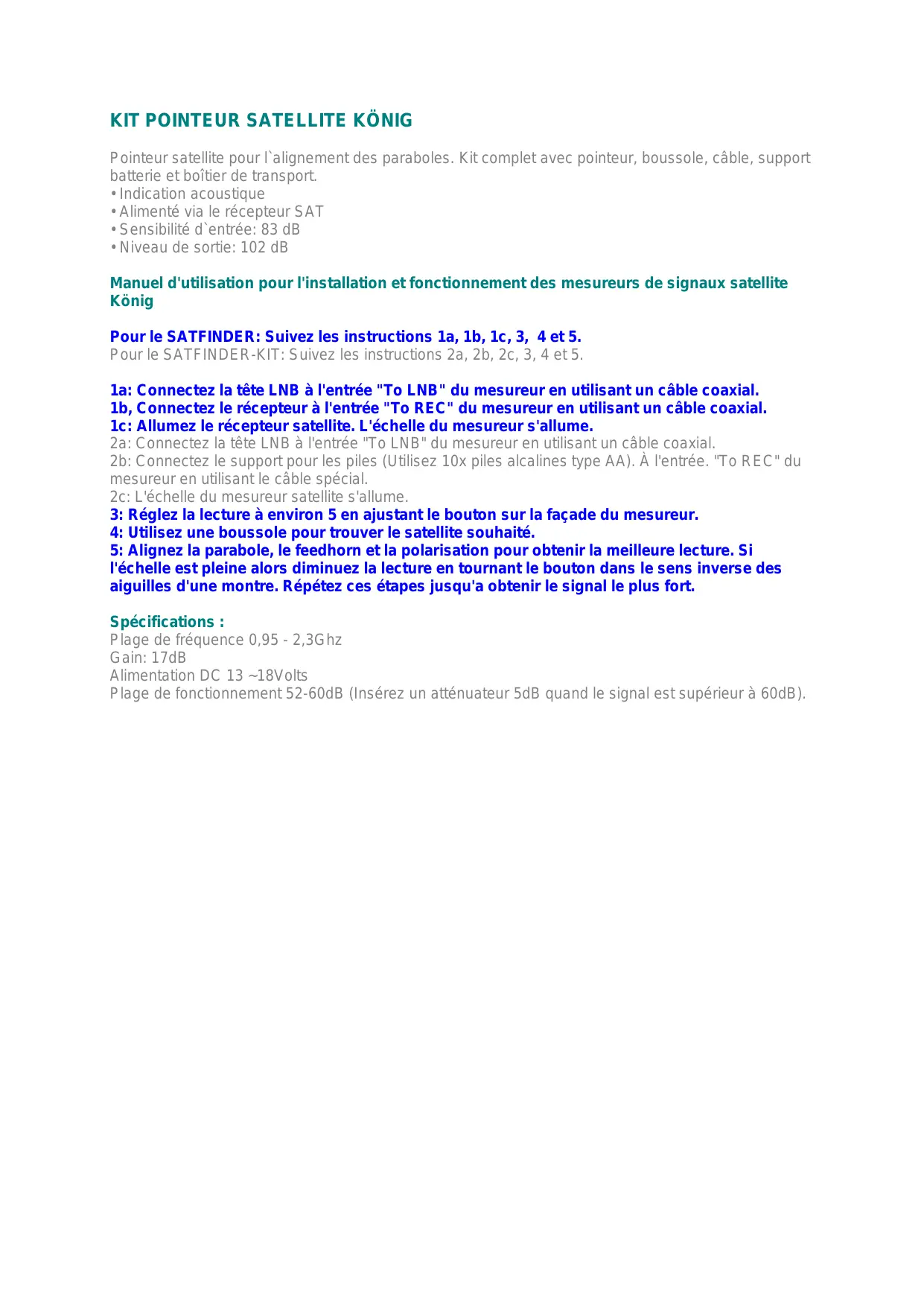 - Niveau de sortie: 102 dB Manuel d'utilisation pour l'installation et fonctionnement des mesureurs de signaux satellite König Pour le SATFINDER: Suivez les instructions 1a, 1b, 1c, 3, 4 et 5. Pour le SATFINDER-KIT: Suivez les instructions 2a, 2b, 2c, 3, 4 et 5. 1a: Connectez la tête LNB à l'entrée "To LNB" du mesureur en utilisant un câble coaxial. 1b, Connectez le récepteur à l'entrée "To REC" du mesureur en utilisant un câble coaxial. 1c: Allumez le récepteur satellite. L'échelle du mesureur s'allume. 2a: Connectez la tête LNB à l'entrée "To LNB" du mesureur en utilisant un câble coaxial. 2b: Connectez le support pour les piles (Utilisez 10x piles alcalines type AA). À l'entrée. "To REC" du mesureur en utilisant le câble spécial. 2c: L'échelle du mesureur satellite s'allume. 3: Réglez la lecture à environ 5 en ajustant le bouton sur la façade du mesureur. 4: Utilisez une boussole pour trouver le satellite souhaité. 5: Alignez la parabole, le feedhorn et la polarisation pour obtenir la meilleure lecture. Si l'échelle est pleine alors diminuez la lecture en tournant le bouton dans le sens inverse des aiguilles d'une montre. Répétez ces étapes jusqu'a obtenir le signal le plus fort. Spécifications : Plage de fréquence 0,95 - 2,3Ghz Gain: 17dB Alimentation DC 13 ~18Volts Plage de fonctionnement 52-60dB (Insérez un atténuateur 5dB quand le signal est supérieur à 60dB).