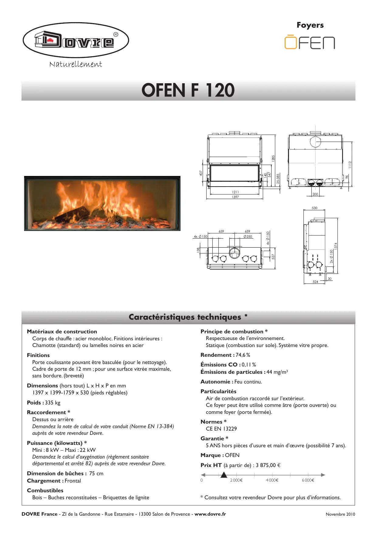Caractéristiques techniques * Matériaux de construction Corps de chauffe : acier monobloc. Finitions intérieures : Chamotte (standard) ou lamelles noires en acier Principe de combustion * Respectueuse de l’environnement. Statique (combustion sur sole). Système vitre propre. Finitions Porte coulissante pouvant être basculée (pour le nettoyage). Cadre de porte de 12 mm ; pour une surface vitrée maximale, sans bordure. (breveté) Rendement : 74,6 % Dimensions (hors tout) L x H x P en mm 1397 x 1399-1759 x 530 (pieds réglables) Poids : 335 kg Raccordement * Dessus ou arrière Demandez la note de calcul de votre conduit (Norme EN 13-384) auprès de votre revendeur Dovre. Puissance (kilowatts) * Mini : 8 kW – Maxi : 22 kW Demandez le calcul d’oxygénation (règlement sanitaire départemental et arrêté 82) auprès de votre revendeur Dovre. Dimension de bûches : 75 cm Chargement : Frontal Combustibles Bois – Buches reconstituées – Briquettes de lignite Émissions CO : 0,11 % Émissions de particules : 44 mg/m3 Autonomie : Feu continu. Particularités Air de combustion raccordé sur l’extérieur. Ce foyer peut être utilisé comme âtre (porte ouverte) ou comme foyer (porte fermée). Normes * CE EN 13229 Garantie * 5 ANS hors pièces d’usure et main d’œuvre (possibilité 7 ans). Marque : OFEN Prix HT (à partir de) : 3 875,00 €