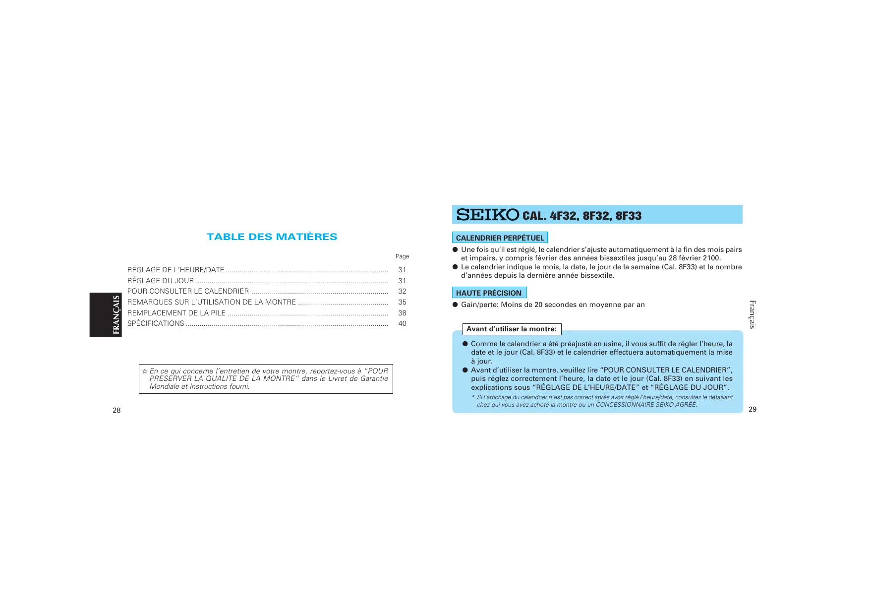 à jour. ● Avant d’utiliser la montre, veuillez lire “POUR CONSULTER LE CALENDRIER”, puis réglez correctement l’heure, la date et le jour (Cal. 8F33) en suivant les explications sous “RÉGLAGE DE L’HEURE/DATE” et “RÉGLAGE DU JOUR”. * Si l’affichage du calendrier n’est pas correct après avoir réglé l’heure/date, consultez le détaillant chez qui vous avez acheté la montre ou un CONCESSIONNAIRE SEIKO AGRÉÉ.