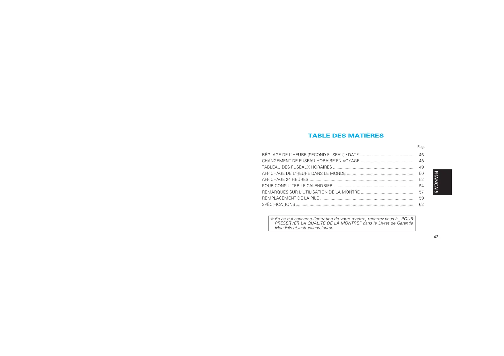 Le calendrier n’est pas affecté par un remplacement de la pile. Cependant, après avoir remplacé la pile par une neuve, vérifiez si l’affichage du calendrier est exact. (Reportez-vous à “POUR CONSULTER LE CALENDRIER”.) Si la montre n’affiche pas correctement l’année bissextile, le mois et la date, faitesla ajuster par un CONCESSIONNAIRE SEIKO AGRÉÉ. 60