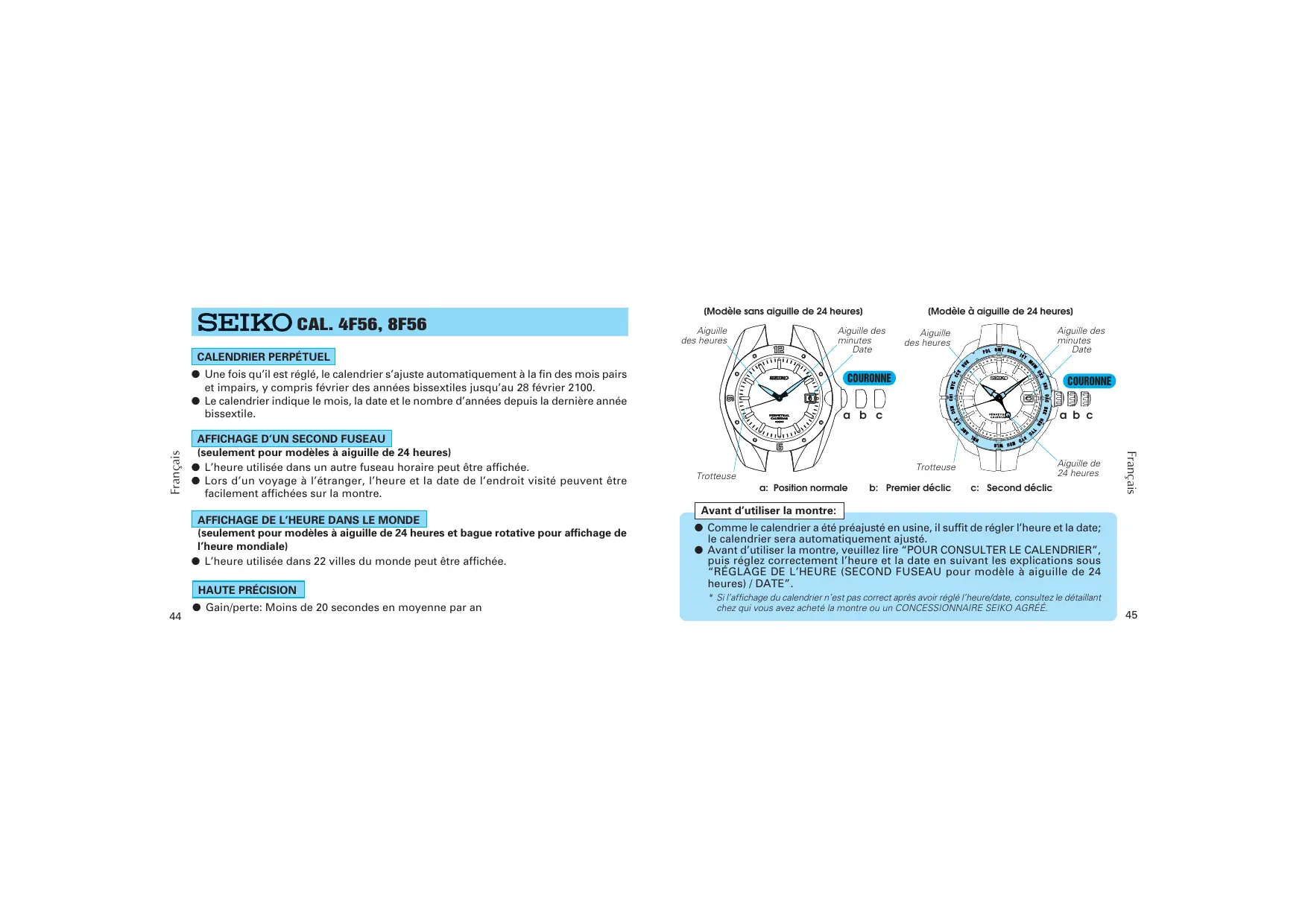Ans [Cal. 8F56] La pile miniaturisée qui alimente votre montre doit durer environ 5 années (Cal. 4F56) / 10 années (Cal. 8F56). Cependant, comme la pile a été installée en usine afin de vérifier les fonctions et les performances de la montre, il se peut que sa durée de vie, une fois la montre en votre possession, soit plus courte que la période spécifiée. Quand la pile est presque épuisée, prenez soin de la remplacer le plus tôt possible pour éviter des erreurs. Lors du remplacement de la pile, nous conseillons de s’adresser à un CONCESSIONNAIRE SEIKO AGRÉÉ et de demander l’emploi d’une pile SEIKO CR1612 (Cal. 4F56) / SEIKO CR2412 (Cal. 8F56). Français Français