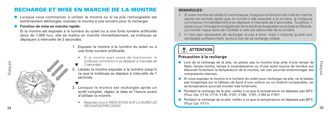Reportez-vous à "INDICATION SUR LA DURÉE DE RECHARGE/PRÉCISION". ATTENTION Précaution à la recharge ● Lors de la recharge de la pile, ne placez pas la montre trop près d’une lampe de flash, lampe torche, lampe à incandescence ou d’une autre source de lumière qui élèverait fortement la température de la montre, car ceci pourrait endommager ses composants internes. ● Si vous exposez la montre à la lumière du soleil pour recharger sa pile, ne la laissez pas longtemps sur le tableau de bord d’une voiture ou un endroit comparable, car sa température pourrait monter très fortement. ● Pendant la recharge de la pile, veillez à ce que la température ne dépasse pas 50ºC. (Pour Cal. V110, V114, V145, V157, V158, V181, V182 et V187) ● Pendant la recharge de la pile, veillez à ce que la température ne dépasse pas 60ºC. (Pour Cal. V111) Français Français
