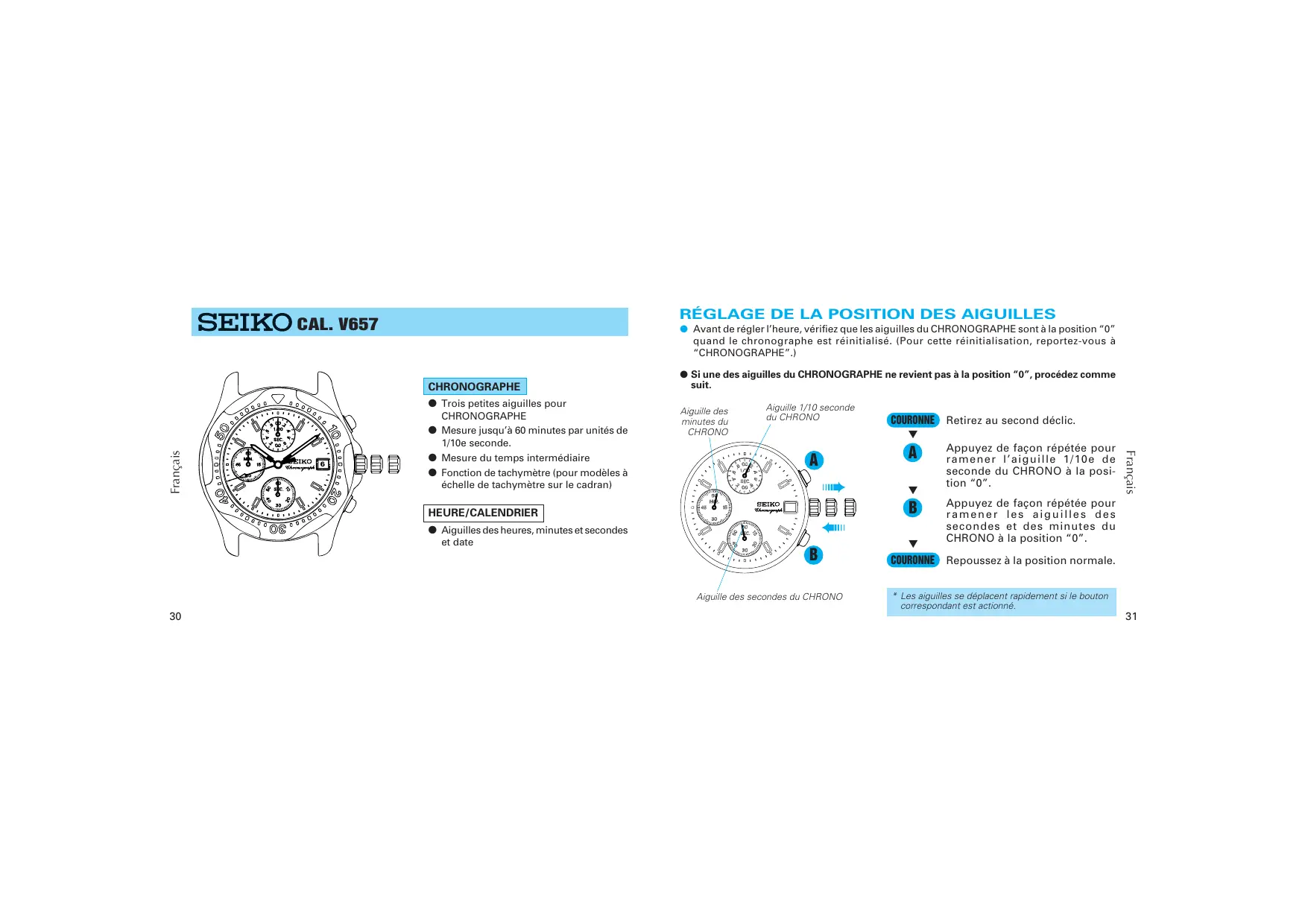 RÉGLAGE DE LA POSITION DES AIGUILLES CAL. V657 ● Avant de régler l’heure, vérifiez que les aiguilles du CHRONOGRAPHE sont à la position “0” quand le chronographe est réinitialisé. (Pour cette réinitialisation, reportez-vous à “CHRONOGRAPHE”.) CHRONOGRAPHE ● Trois petites aiguilles pour CHRONOGRAPHE