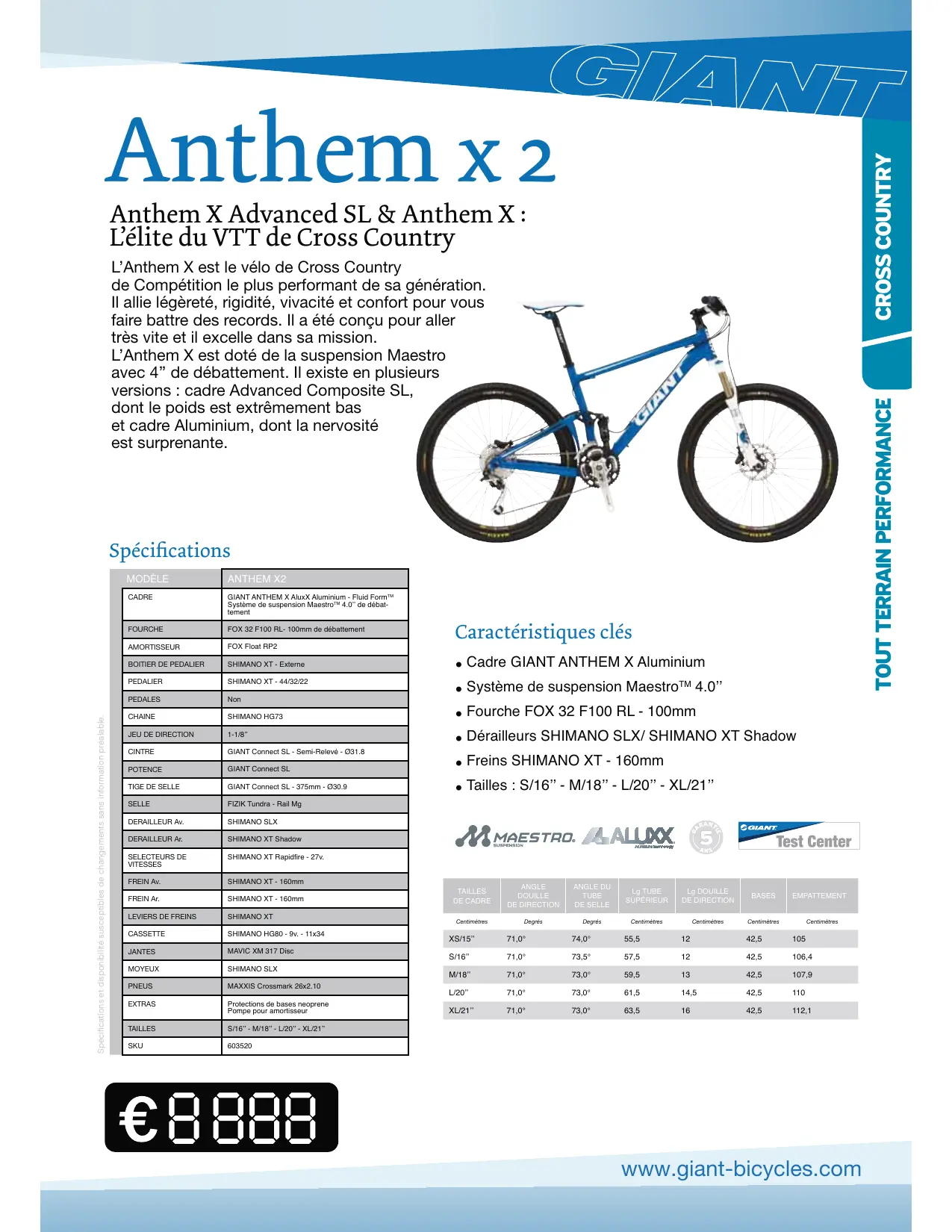 L'Anthem X est le vélo de Cross Country de Compétition le plus performant de sa génération. Il allie légèreté, rigidité, vivacité et comportement pour vous faire battre des records. Il a été conçu pour aller très vite et il excelle dans sa mission. L'Anthem X est doté de la suspension Maestro avec 4" de débattement. Il existe en plusieurs versions : cadre Advanced Composite SL, dont le poids est extrêmement bas et cadre Aluminium, dont la nervosité est surprenante.